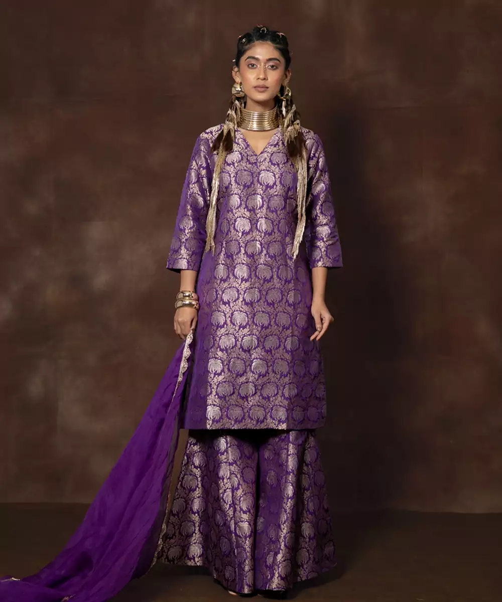 Purple Banarsi Brocade Silk Kurta With Gharara And Organza Duppatta Colour: Purple Fabric: Banarsi Silk Components : 1 Kurta / 1 Gharara / 1 Dupatta