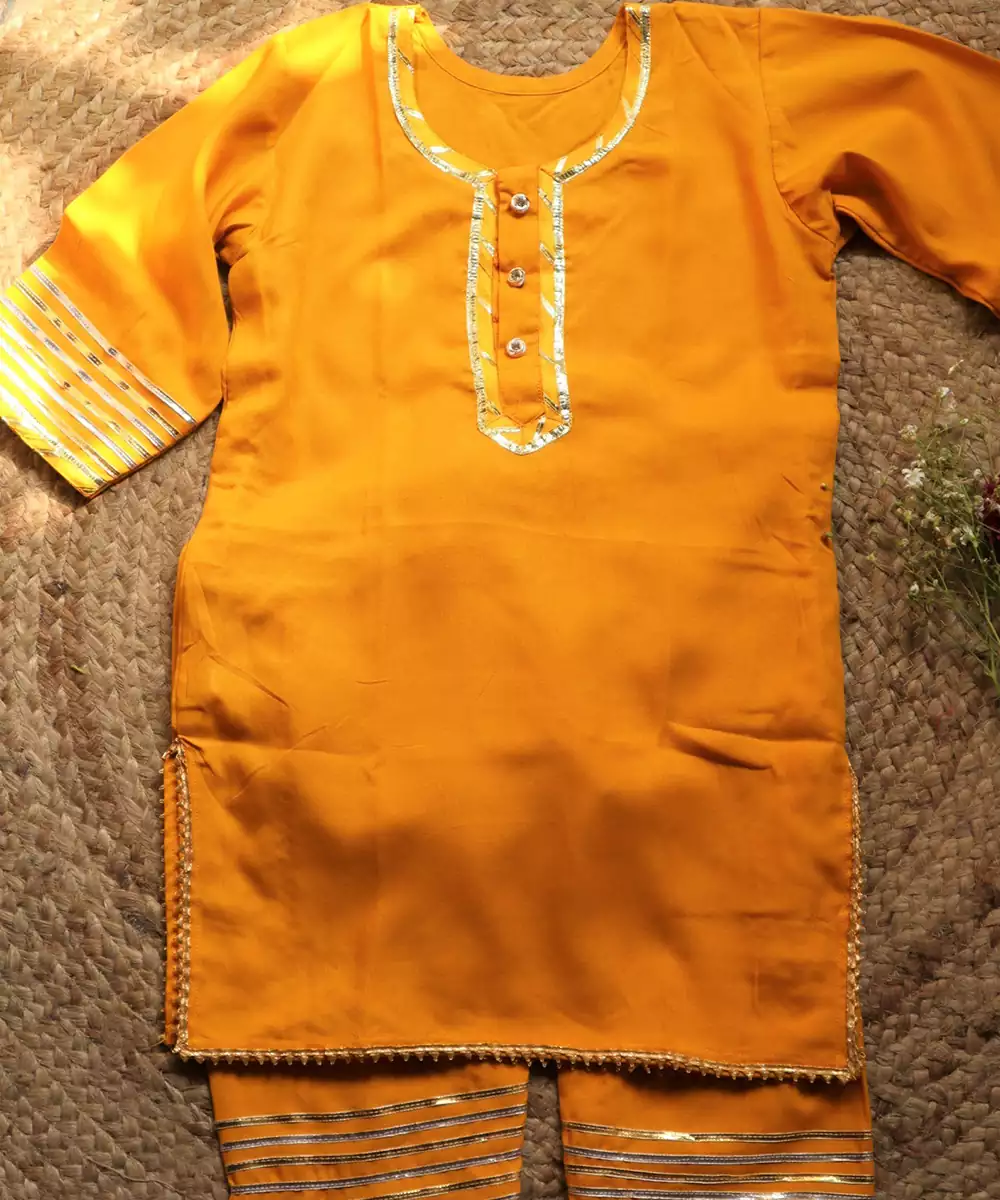 This Turmeric Coloured Kurta Pyjama Has Been A Dream Come True For All The Mums Out There Who Have Been Wanting To Get Their Girls Dressed In Ethnic Yet Comfortable Wear. Made In Soft Cotton Fabric Is Non Itchy For Kids. The Gold And Silver Trims And The Very Famous Rajasthani Magzi Makes This Outfit A Perfect Wear For Festivie And Wedding Season. Fabric Cotton