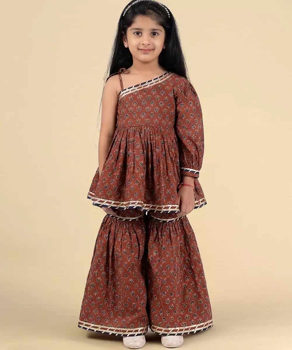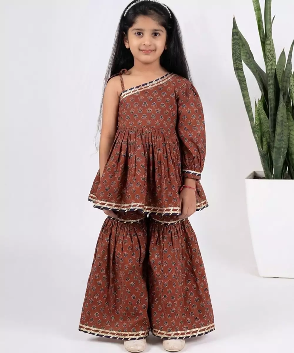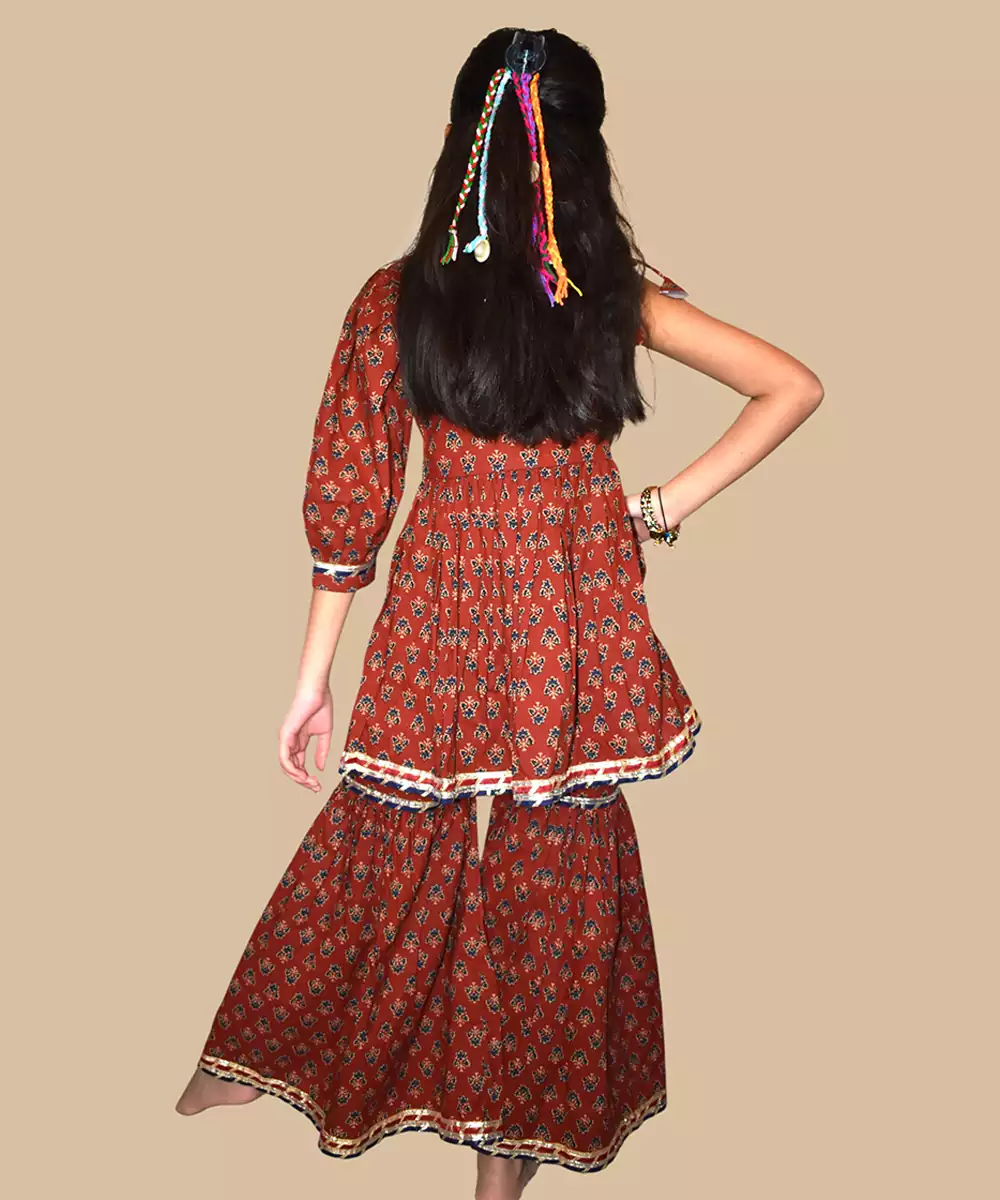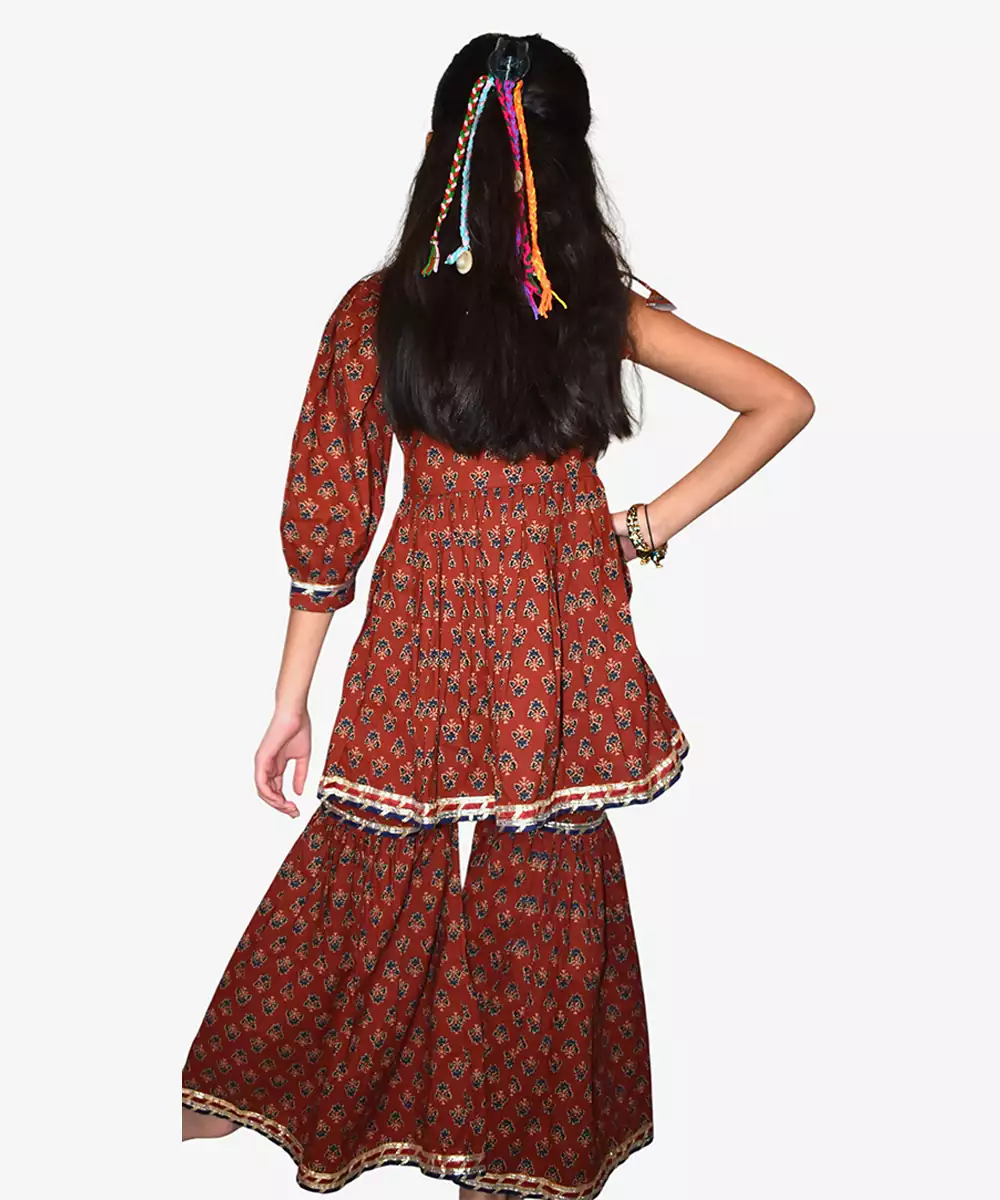 This Maroon Printed Cotton Sharara Set Showcases Rich Elegance With A Touch Of Festive Flair. Made From Soft, Breathable Cotton, It Features Beautiful Prints That Enhance Its Traditional Appeal. Perfect For Celebrations And Special Occasions, It Offers Comfort, Graceful Movement, And Timeless Ethnic Charm.