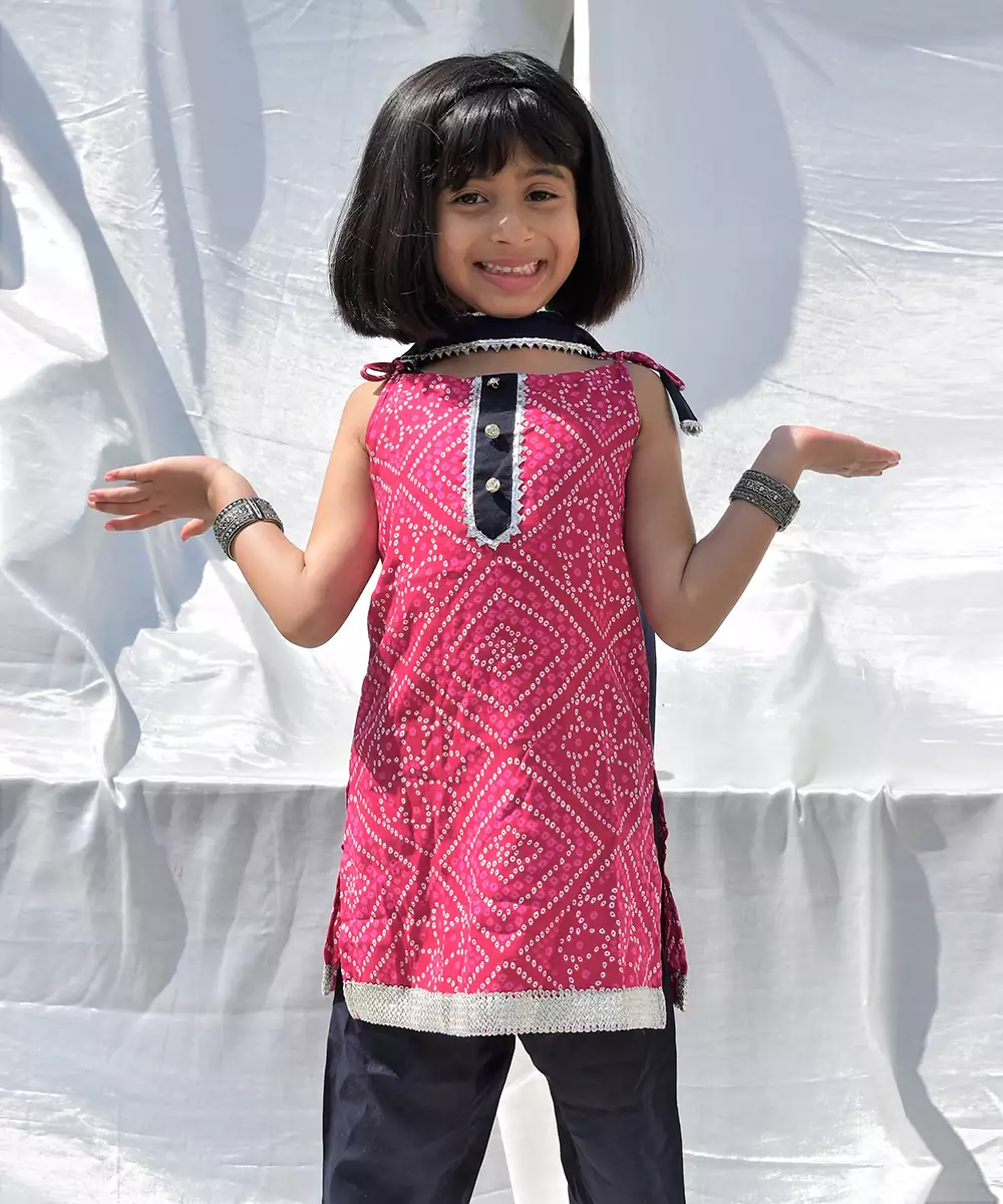 Be It Festivities Or A Family Gathering, Dress Your Little Princess In This Exquisite, Pink And Blue Suit Set. The Set Of 3 Pieces, Consisting Of A Bhandhani Print Pink Kurta, Dark Blue Payjama And Same Coloured Dupatta, Will Provide Her With An Exquisite, Yet Comfortable Look. From Raksha Bandhan To Diwali, She Will Have An Elegant Look That Will Make Her Stand Out.