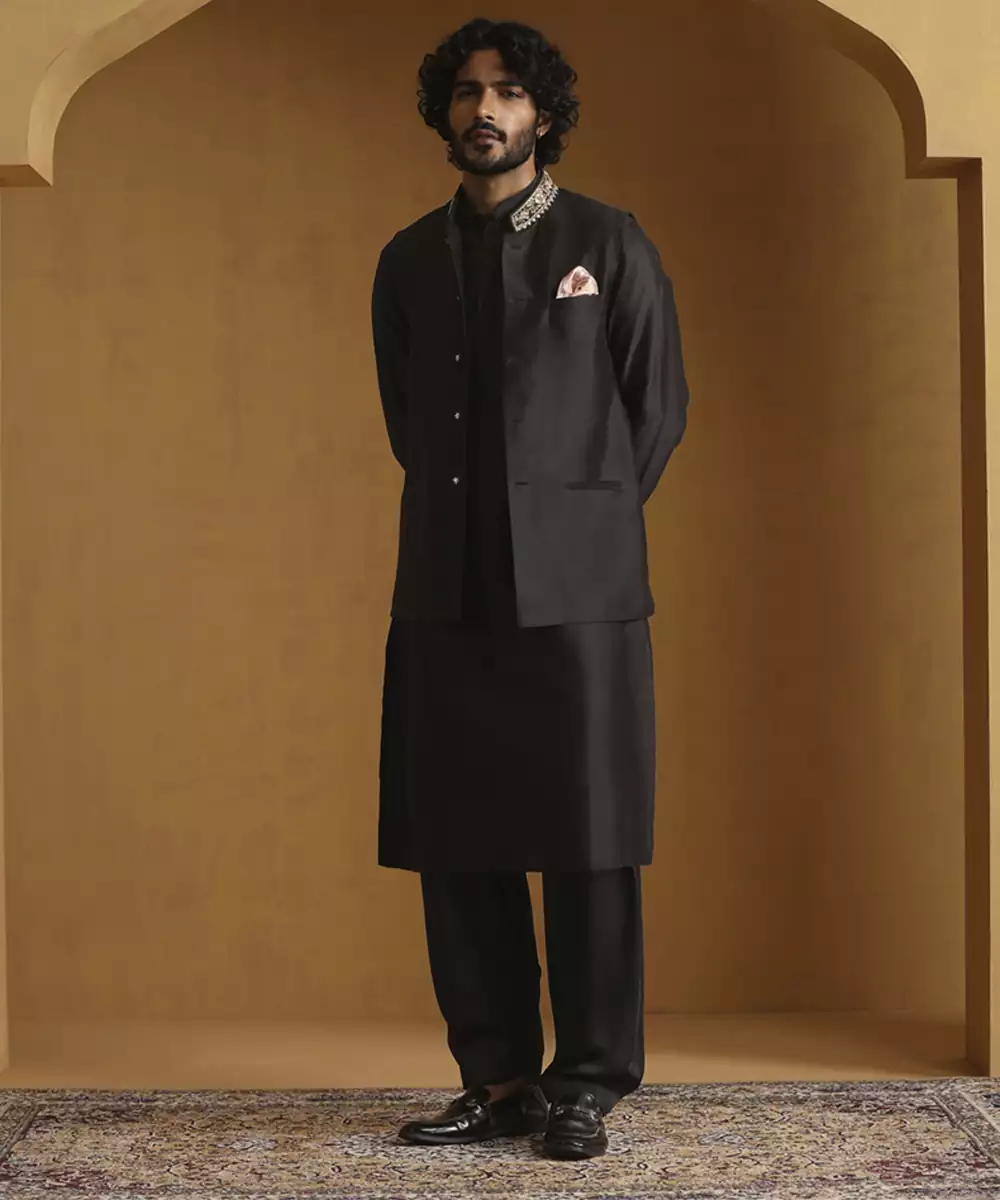 Black Chanderi Kurta With Salwar And Nehru Jacket With Hand Embroidered Collar An Ode To Eternal Grace And Panache, Our Black Chanderi Kurta Paired With A Classic Salwar And A Statement Nehru Jacket Seamlessly Blends Tradition With Sophistication. The Timeless Black Hue And Premium Chanderi Fabric Exude A Luxurious Feel, While The Delicately Hand Embroidered Collar Adds An Exquisite Touch Of Richness.
