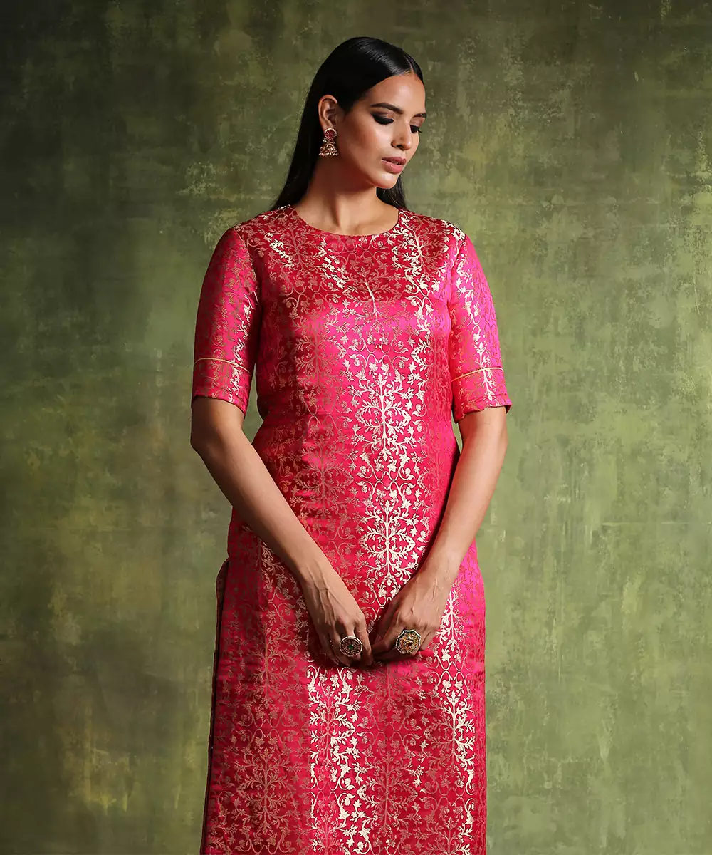 Hot Pink Handwoven Banarasi Brocade Kurta Fashioned In Pure Katan Silk Is An Alluring Piece To Have In Your Wardrobe. The Kurta Is Designed With Closed Neck And Elbow Length Sleeves Giving It A Formal Yet Entirely Graceful Look. The Alluring Set Designed In Mesmerizing Brocade Jaal Is A Must Have This Season. The Intricately Handwoven Jaal Pattern Spreads Throughout The Kurta Accompanied With Pants In Raw Silk With An Elasticated Back And Pockets.