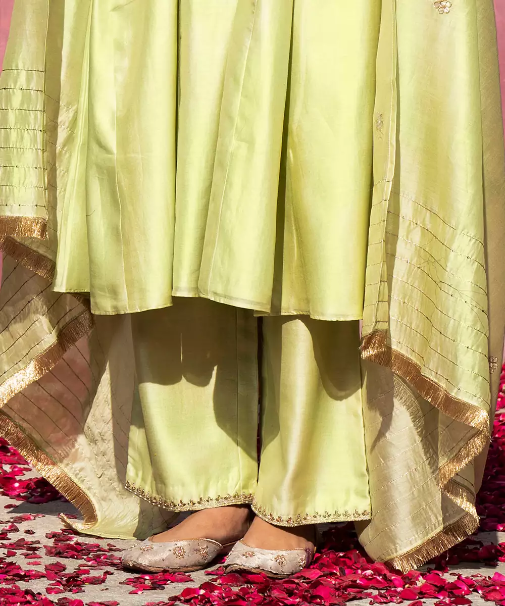 A Blend Of Pastel Shades With Classic Gota Patti Work Will Serve You Well This Spring Season. Whether Your Traditional Wear Closet Needs An Update Or You Want To Stay Ahead Of The Curve, This Festive Season, This Lime Green Stitched Suit Set Will Definitely Find A Fan In You. Made With Premium Quality Chanderi Silk, The Side Kali Kurta Features A Boat Neck That Keeps Things Easy And Elegant. The Minimal But Eye Catching Gota Patti Work On The Yoke And Sleeves Is What Makes This Kurta A Real Hero Piece. The Lime Green Shade Has The Ability To Stand Out Amongst The Otherwise Bright Hues That Dominate Indian Attires. The Anti Fit Easy To Wear Silhouette Lends The Outfit A Relaxed Vibe While The Timeless Appeal Of The Gota Patti Work Ensures Its Festive Mood. The Stitched Pants With A Similar Gold Gota Patti Border And An Embroidered Dupatta Of The Same Hue Add To The Entire Look And Give It A Stylish Finesse. The Handloom Chanderi Suit Set Is A Great Addition To Your Cool Ethnics That Can Be Worn More Often.