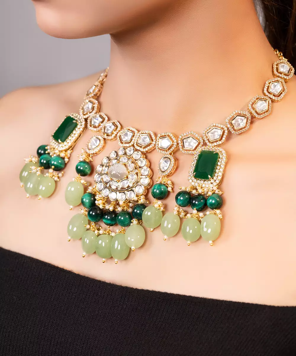 This Gold Plated Kundan Green Stone Necklace Exudes Timeless Elegance And Regal Charm. Crafted With A Radiant Gold Finish And Adorned With Classic Kundan Work And Vibrant Green Stones, It Adds A Rich, Sophisticated Touch. Perfect For Weddings And Festive Occasions, It Offers A Graceful Statement With Traditional Ethnic Appeal.