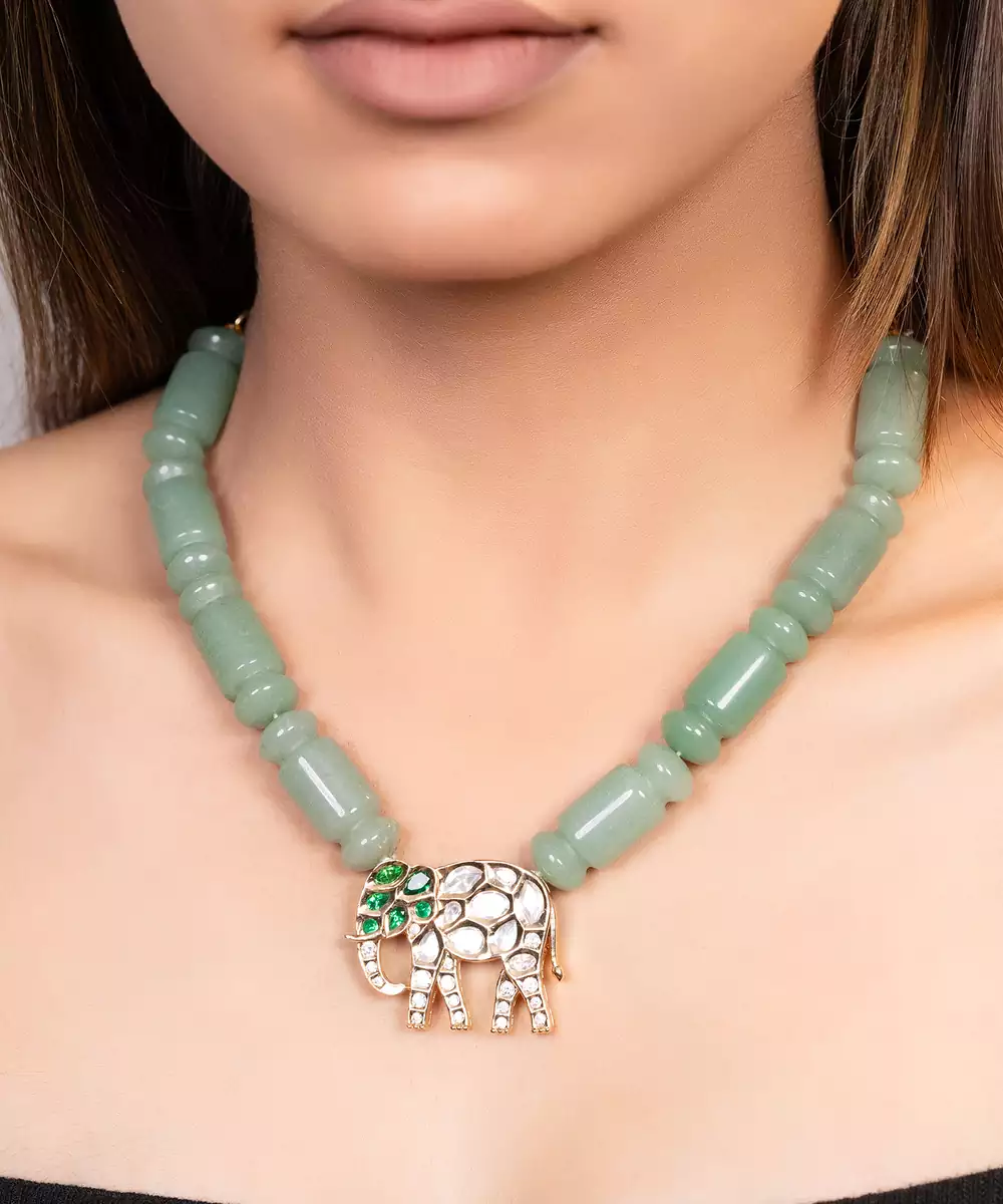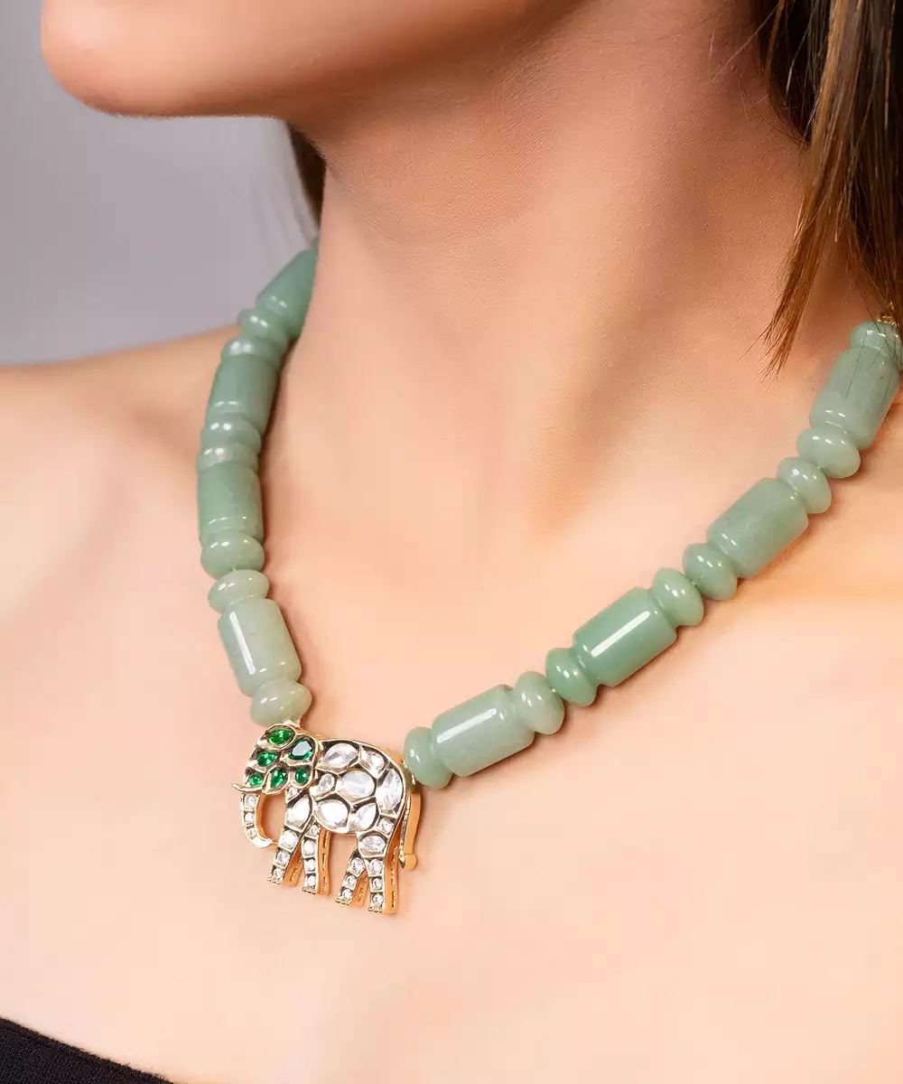 This Gold Plated Kundan Green Stone Necklace Exudes Timeless Elegance And Regal Charm. Crafted With A Radiant Gold Finish And Adorned With Classic Kundan Work And Vibrant Green Stones, It Adds A Rich, Sophisticated Touch. Perfect For Weddings And Festive Occasions, It Offers A Graceful Statement With Traditional Ethnic Appeal.