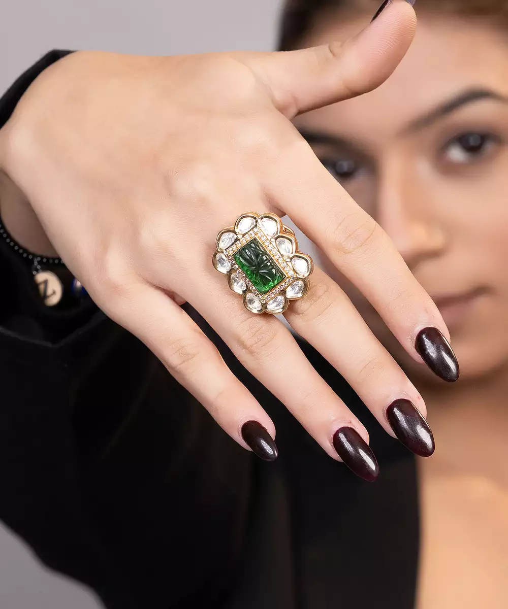 This Gold Plated Kundan Green Stone Ring Reflects Timeless Elegance And Regal Charm. Crafted With A Radiant Gold Finish And Adorned With Classic Kundan Work And A Vibrant Green Stone, It Adds A Rich, Sophisticated Touch. Perfect For Festive Occasions And Weddings, It Offers A Graceful Statement With Traditional Ethnic Appeal.
