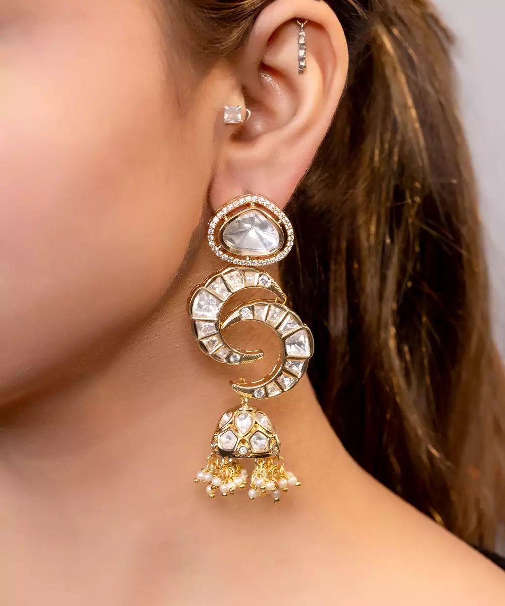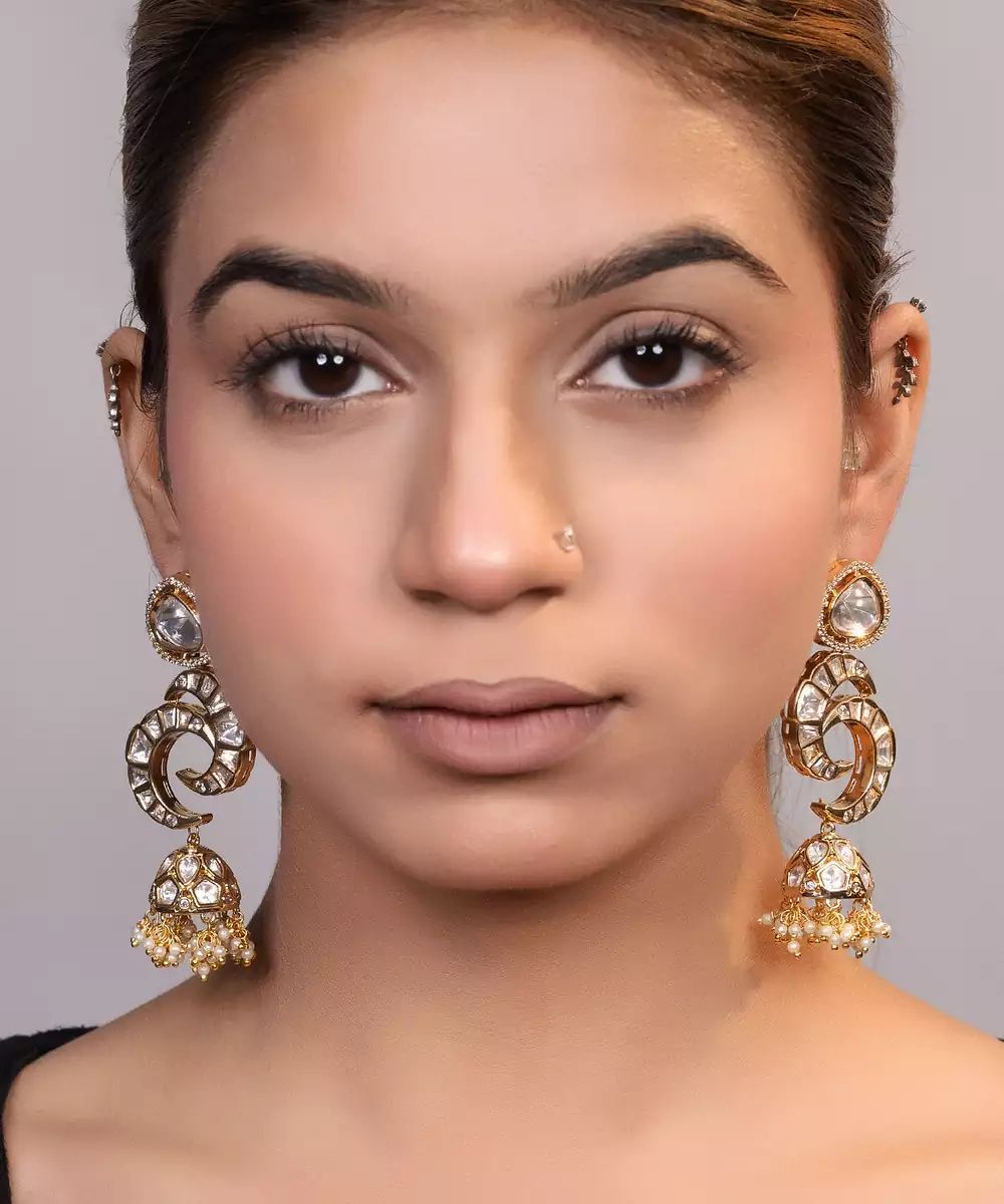 This Gold Plated Kundan Jhumka Earrings Exude Classic Elegance And Traditional Charm. Crafted With A Radiant Gold Finish And Adorned With Intricate Kundan Detailing, They Add A Rich, Graceful Touch. Perfect For Weddings And Festive Occasions, They Offer Beautiful Movement And Timeless Ethnic Appeal.
