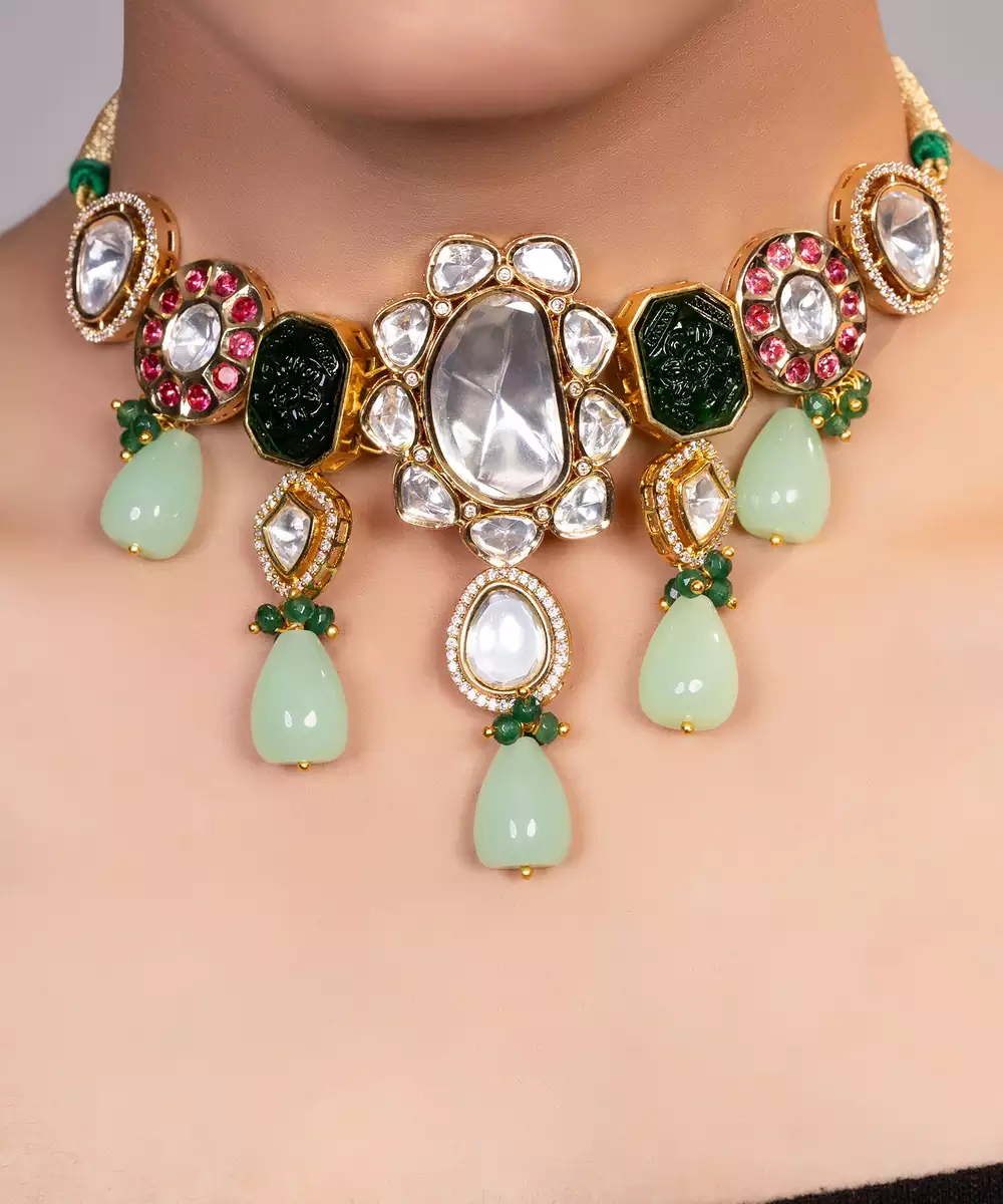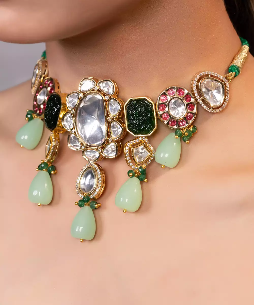 This Gold Plated Kundan Multicolor Stone Choker Necklace Showcases Regal Elegance And Traditional Charm. Crafted With A Radiant Gold Finish And Adorned With Classic Kundan Work And Vibrant Green Stones, It Adds A Rich, Statement Touch. Perfect For Weddings And Festive Occasions, It Offers A Bold, Graceful Look With Timeless Ethnic Appeal.