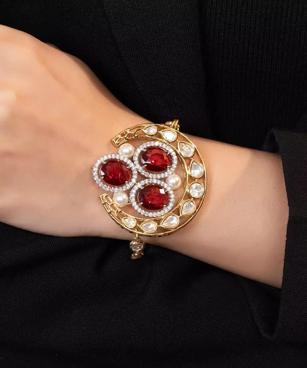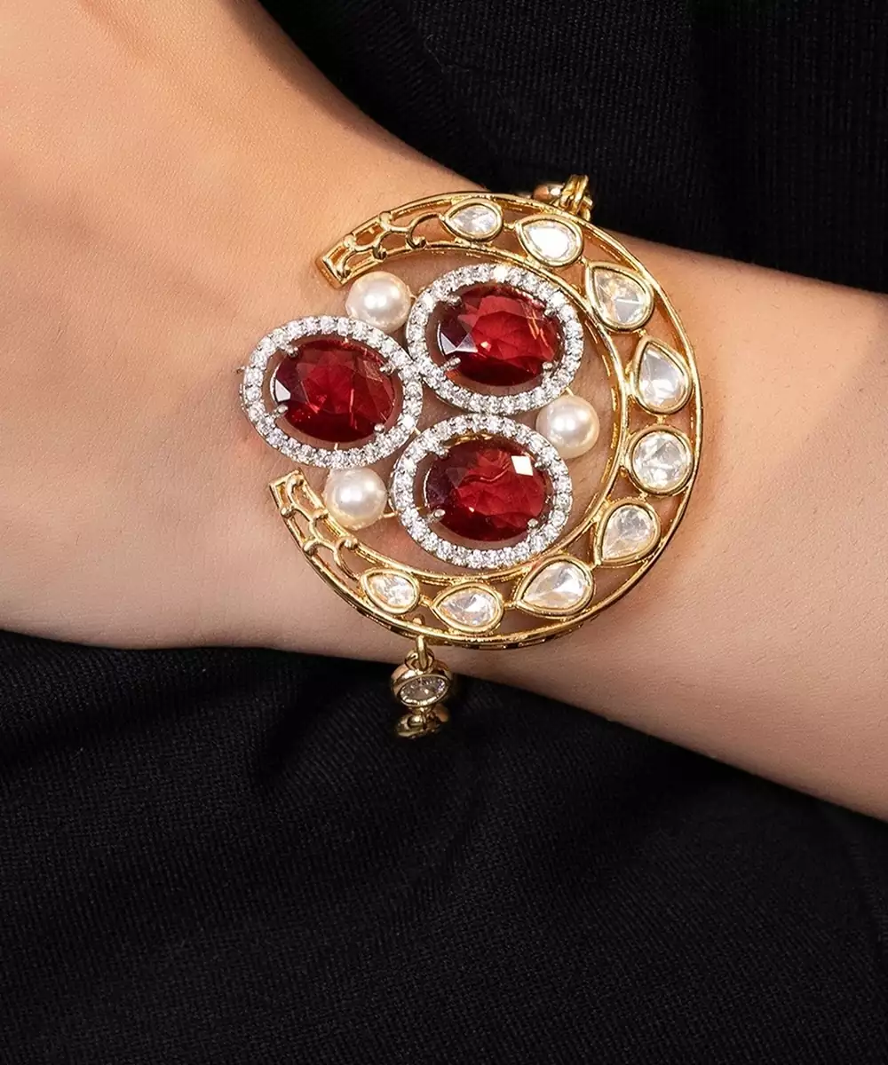 This Gold Plated Kundan Red Stone Bracelet Exudes Regal Elegance And Timeless Charm. Crafted With A Radiant Gold Finish And Adorned With Classic Kundan Work And Rich Red Stones, It Adds A Luxurious Touch. Perfect For Festive Occasions And Weddings, It Offers Graceful Style And Traditional Appeal.