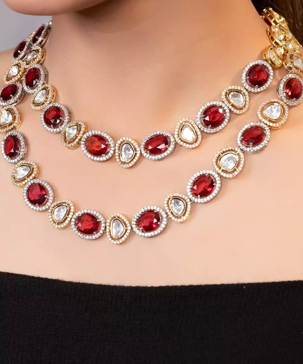 This Gold Plated Kundan Red Stone Necklace Exudes Regal Elegance And Timeless Charm. Crafted With A Radiant Gold Finish And Adorned With Classic Kundan Work And Rich Red Stones, It Adds A Bold, Luxurious Touch. Perfect For Weddings And Festive Occasions, It Offers A Statement Look With Traditional Ethnic Appeal.