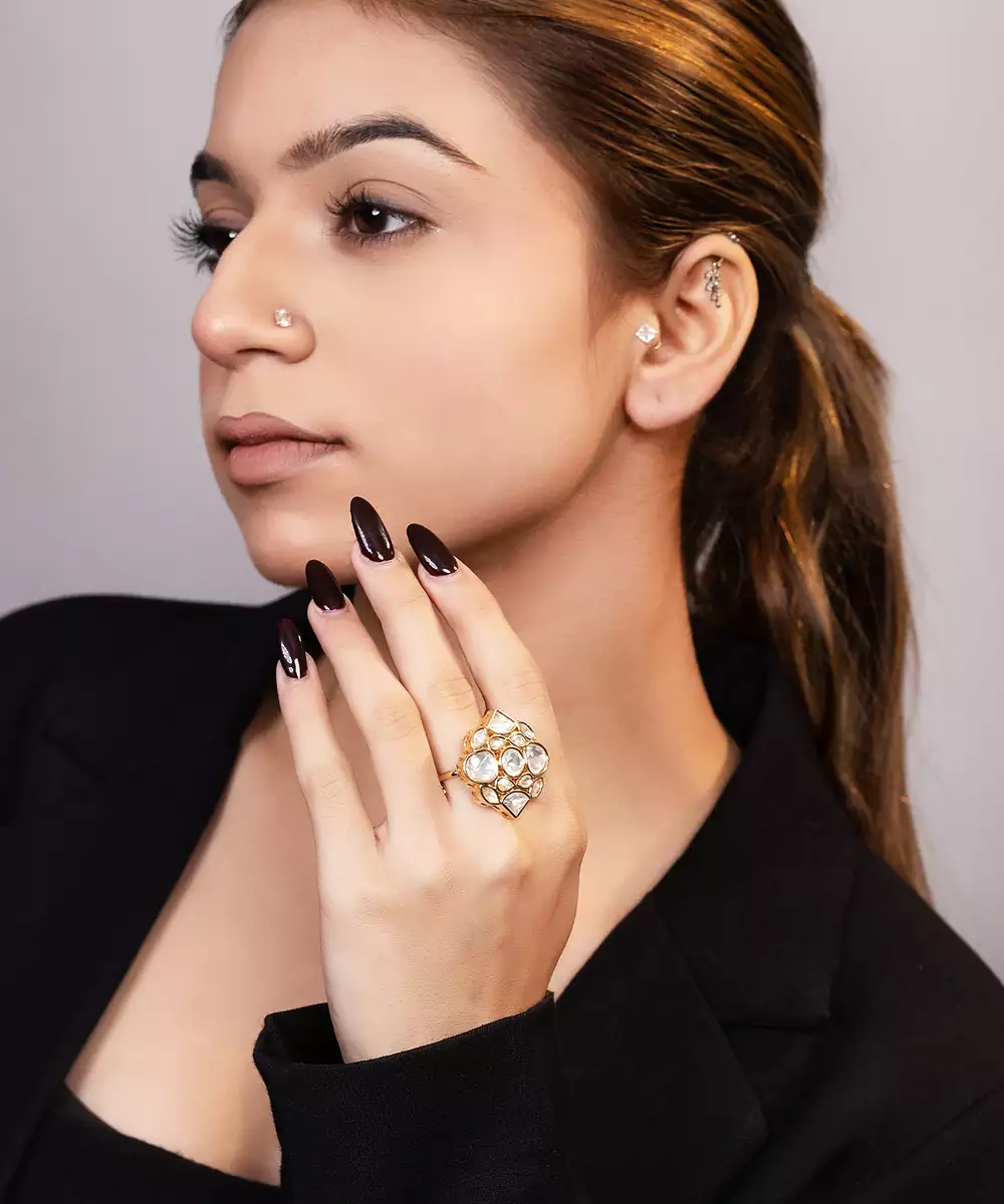 This Gold Plated Kundan Ring Exudes Timeless Elegance And Traditional Charm. Crafted With A Radiant Gold Finish And Adorned With Classic Kundan Detailing, It Adds A Regal Touch To Any Look. Perfect For Festive Occasions And Weddings, It Offers Graceful Style And Statement Appeal.