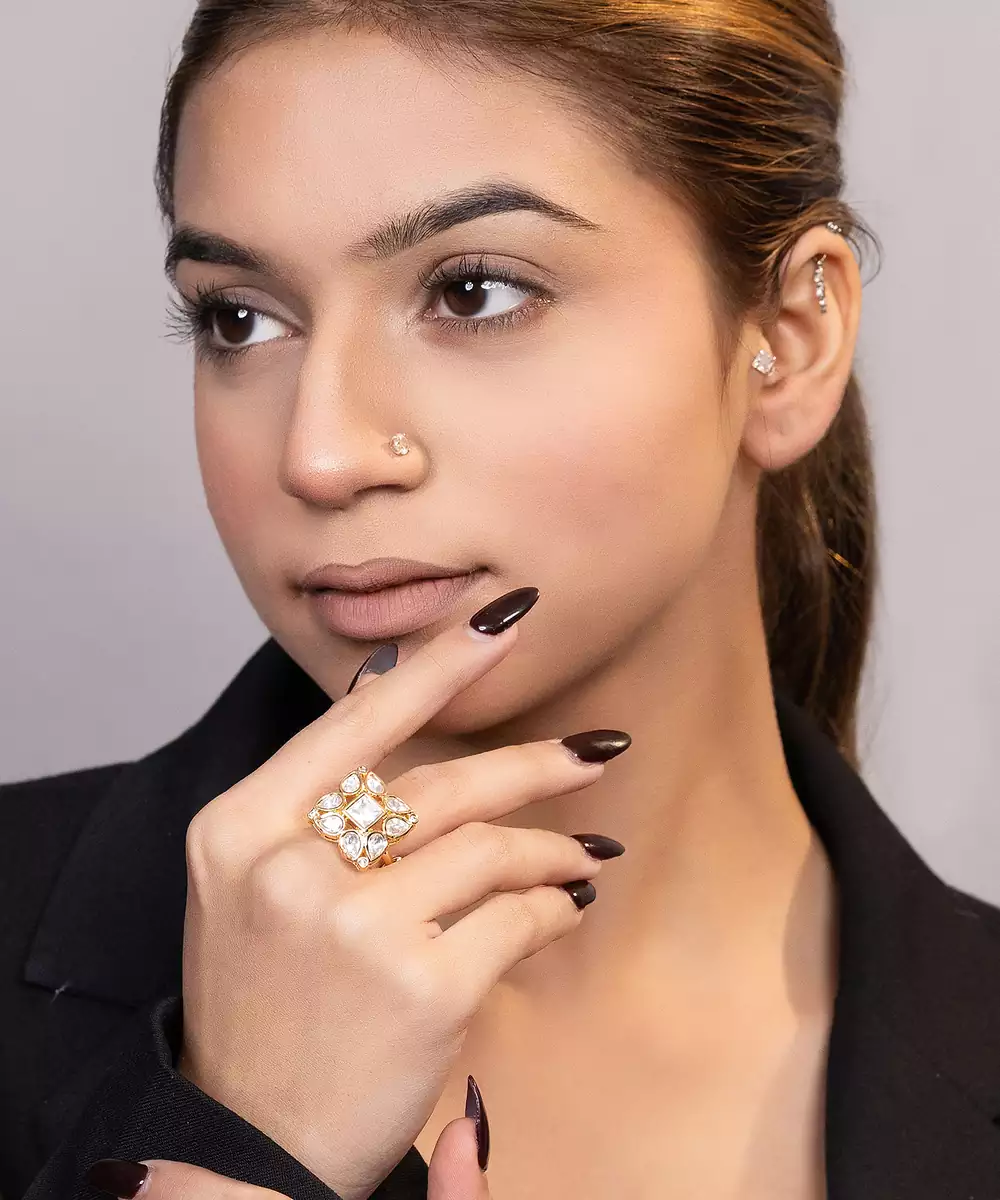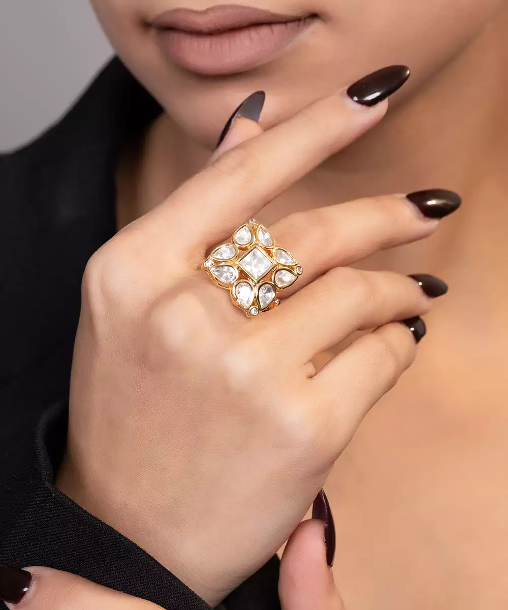 This Gold Plated Kundan Ring Exudes Timeless Elegance And Traditional Charm. Crafted With A Radiant Gold Finish And Adorned With Classic Kundan Detailing, It Adds A Regal Touch To Any Look. Perfect For Festive Occasions And Weddings, It Offers Graceful Style And Statement Appeal.