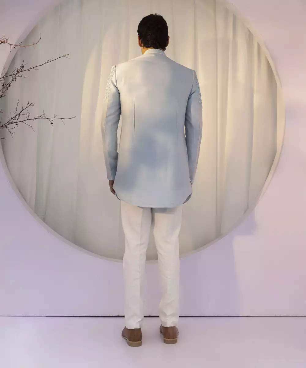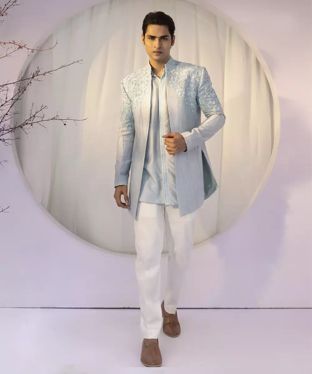 Featuring A Powder Blue Open Achkan Set With Heavy Shoulder Embroidery Detailing Paired With Front Open Kurta With Heavy Work On The Placket And Off White Or Same Colour Pant Pyjama. .