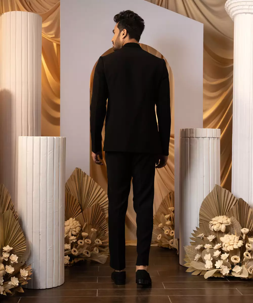 Featuring A Black Bandhgala With Layered Detailing. It Is Paired With Matching Trousure.