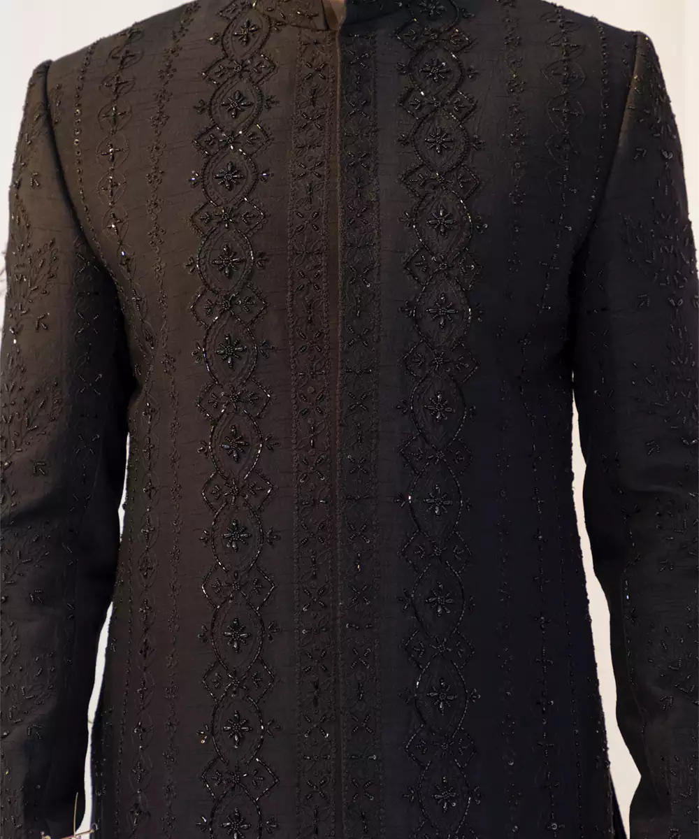 Featuring A Black Dori Work Achkan With Highlights Of Cutdana And Chid, Paired With Matching Trousers.