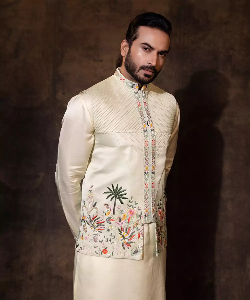 Featuring A Mint Green Linen Satin Nehru Jacket With Intricate Pastel Embroidery On The Front Panel Inspired By Desert Palms Paired With Matching Linen Satin Kurta And Off White Pant Pyjama.