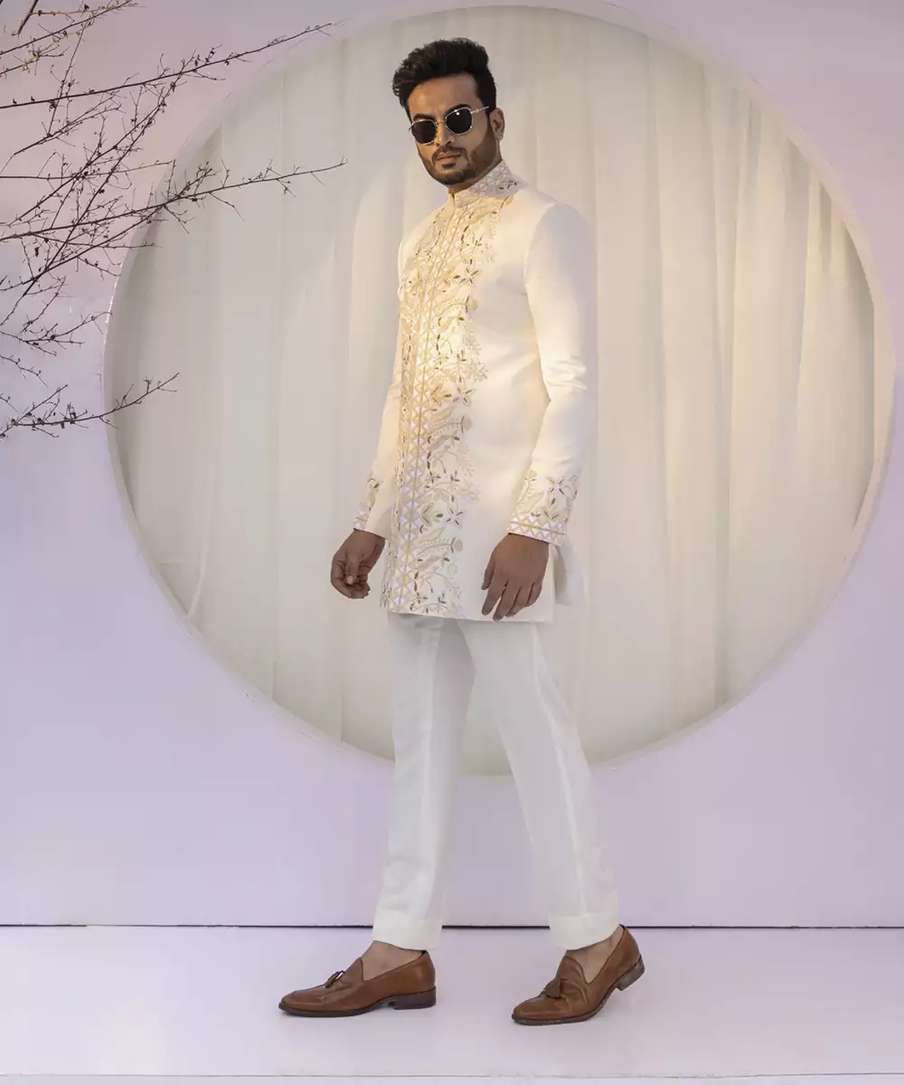 Featuring An Ivory Achkan With Zardozi And Threadwork Embellishments With Connected Embroidery Across The Center Front Paired With Matching Trousers.