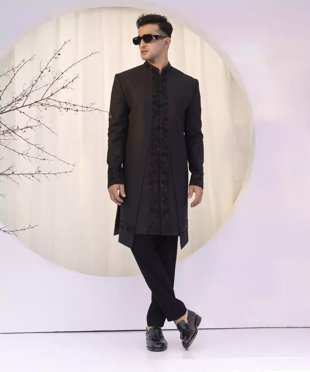 Featuring Center Front Embroidered, Sharp Structured Achkan,Paired With Matching Trousers. Colour: Black Fabric: Wool Components : 1 Achkan / 1 Trouser