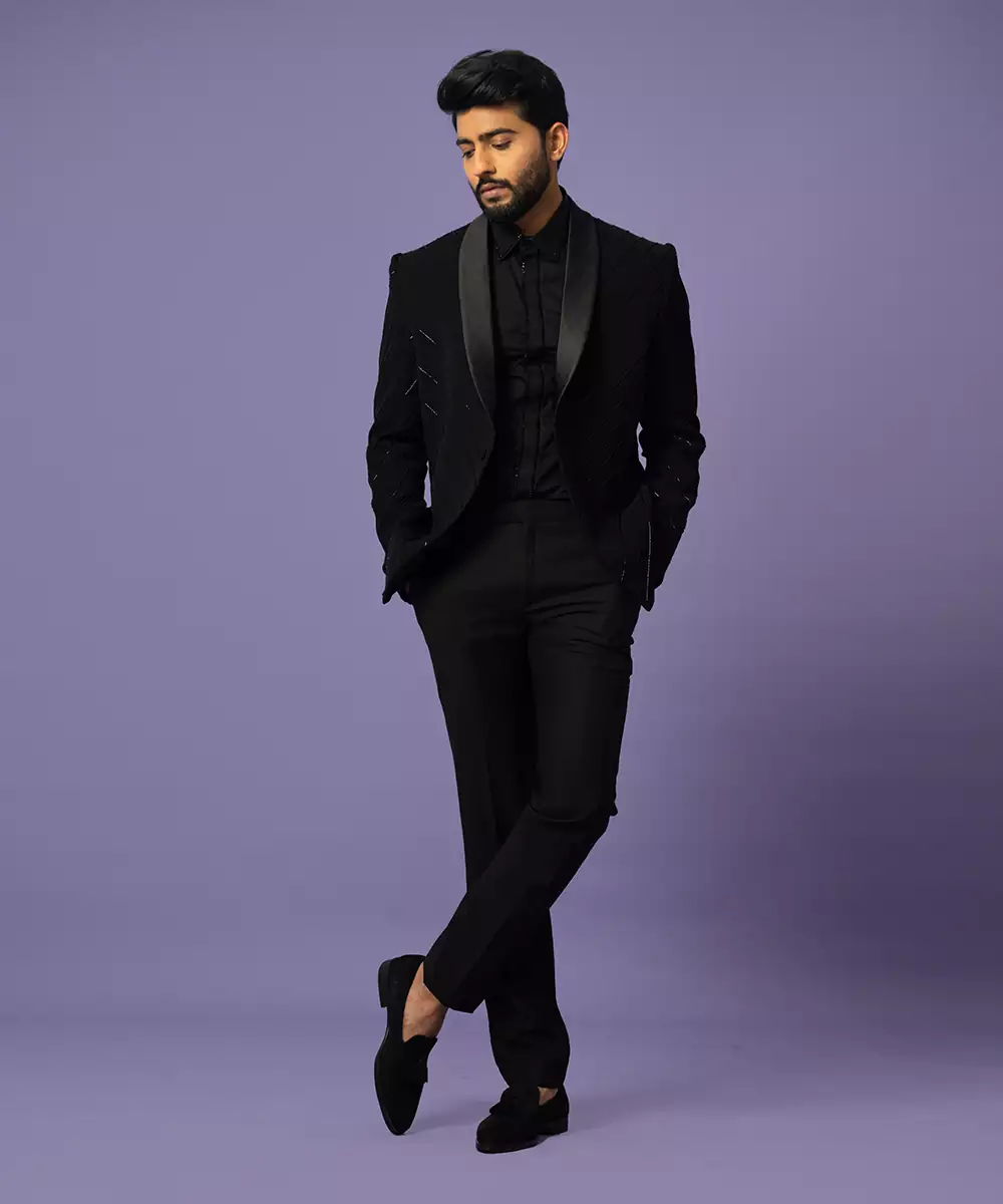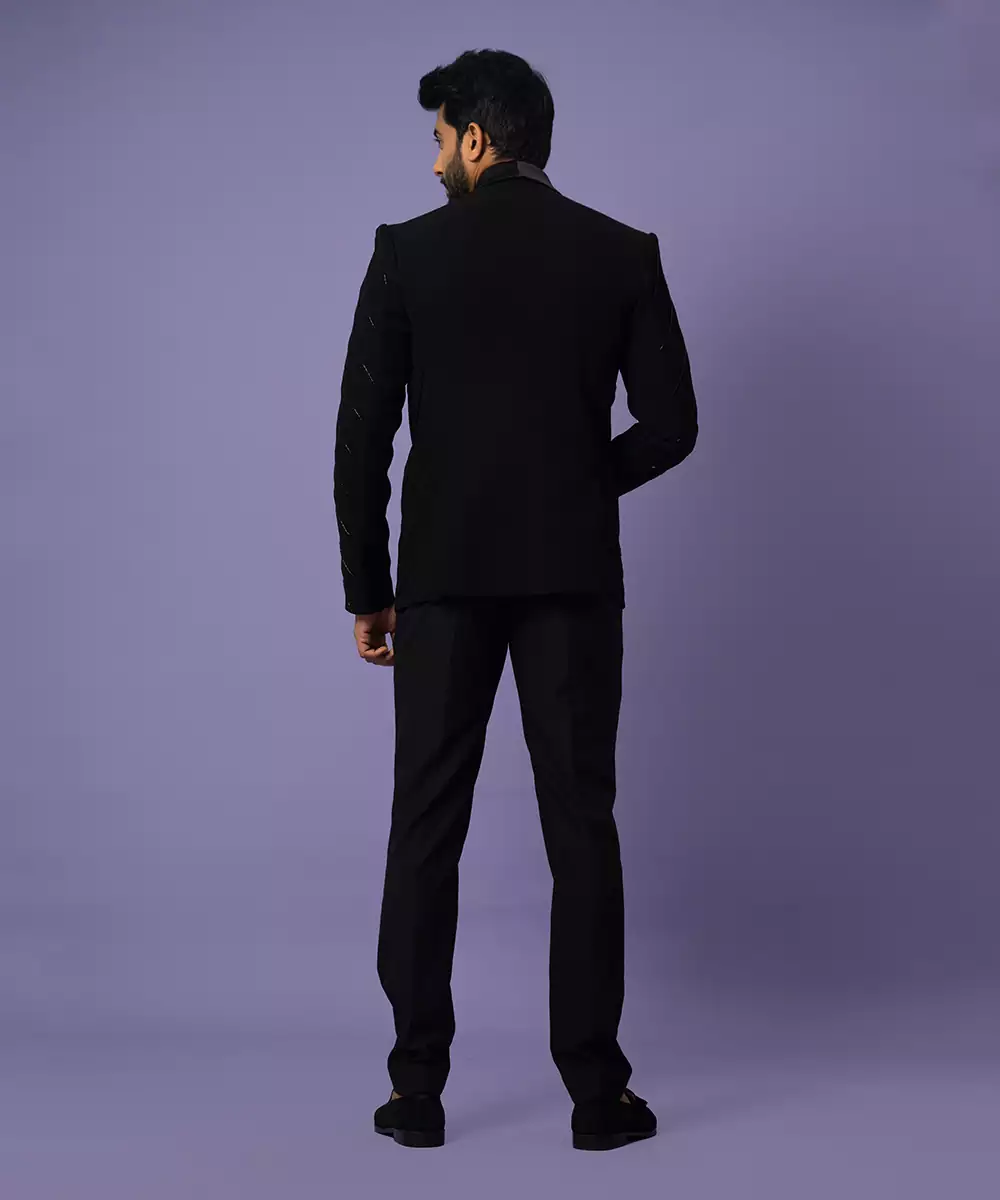 Featuring A Black Suit Set Embroidered With Cutdana Lines Paired With Black Trousers.