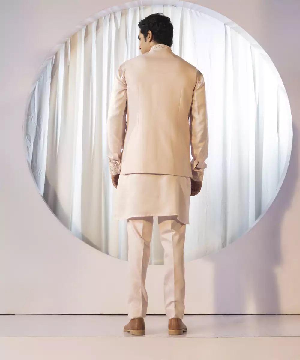 Ice Pink Nehru Jacket With Tone On Tone Thread Embroidery Paired With Kurta And Slim Fit Pant Pyjama.