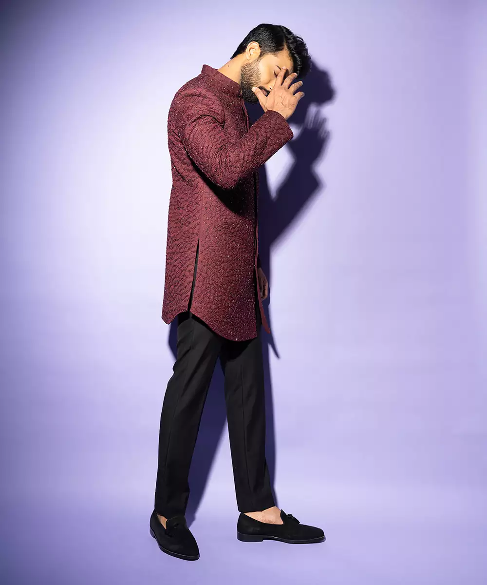 Featuring A Wine Embellished Mid Length Apple Cut Achkan In Threadwork & Chid Embroidery All Over Paired With Black Trousers.