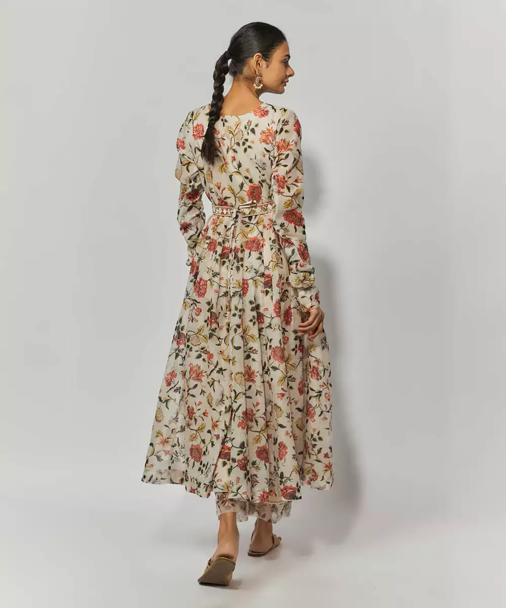 Featuring A Beige Printed Anarkali In Chanderi Base With Churidar Sleeves And Marodi Work. It Is Paired With Matching Pants, An Organza Dupatta And A Marodi Work Belt.