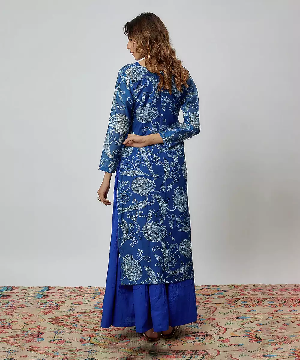 Featuring A Blue Printed Kurta In Chanderi Base. It Is Paired With A Matching Blue Cotton Crushed Anarkali, Pants, And An Organza Dupatta Having Fringes On The Bottom.