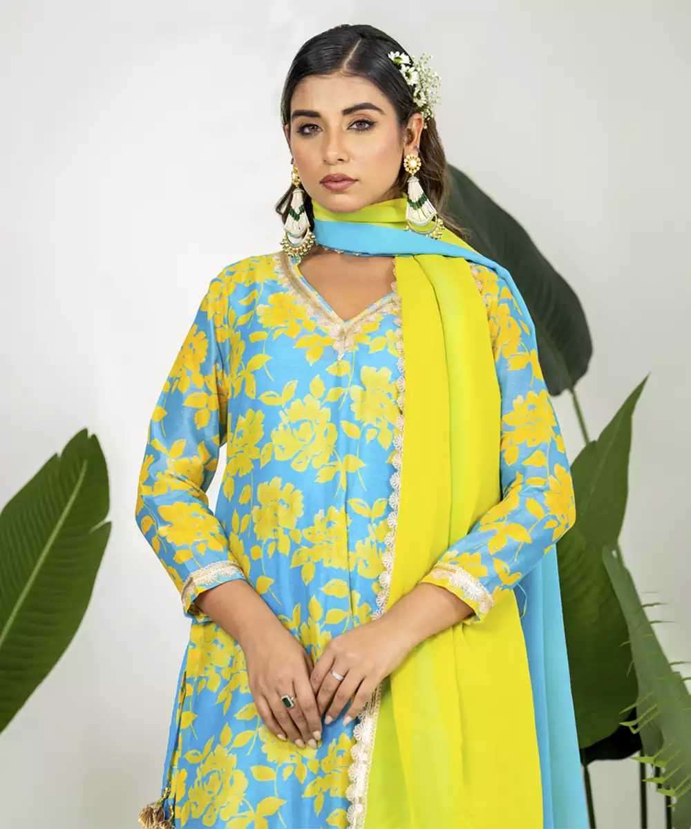 Featuring A Neon Blue & Yellow Kurta In Chanderi Base With Digital Floral Print. It Is Paired With An Inner, Cotton Pants And An Organza Dupatta. Accentuate It With Chandbali Earrings And Juttis For A Festive Ready Look.