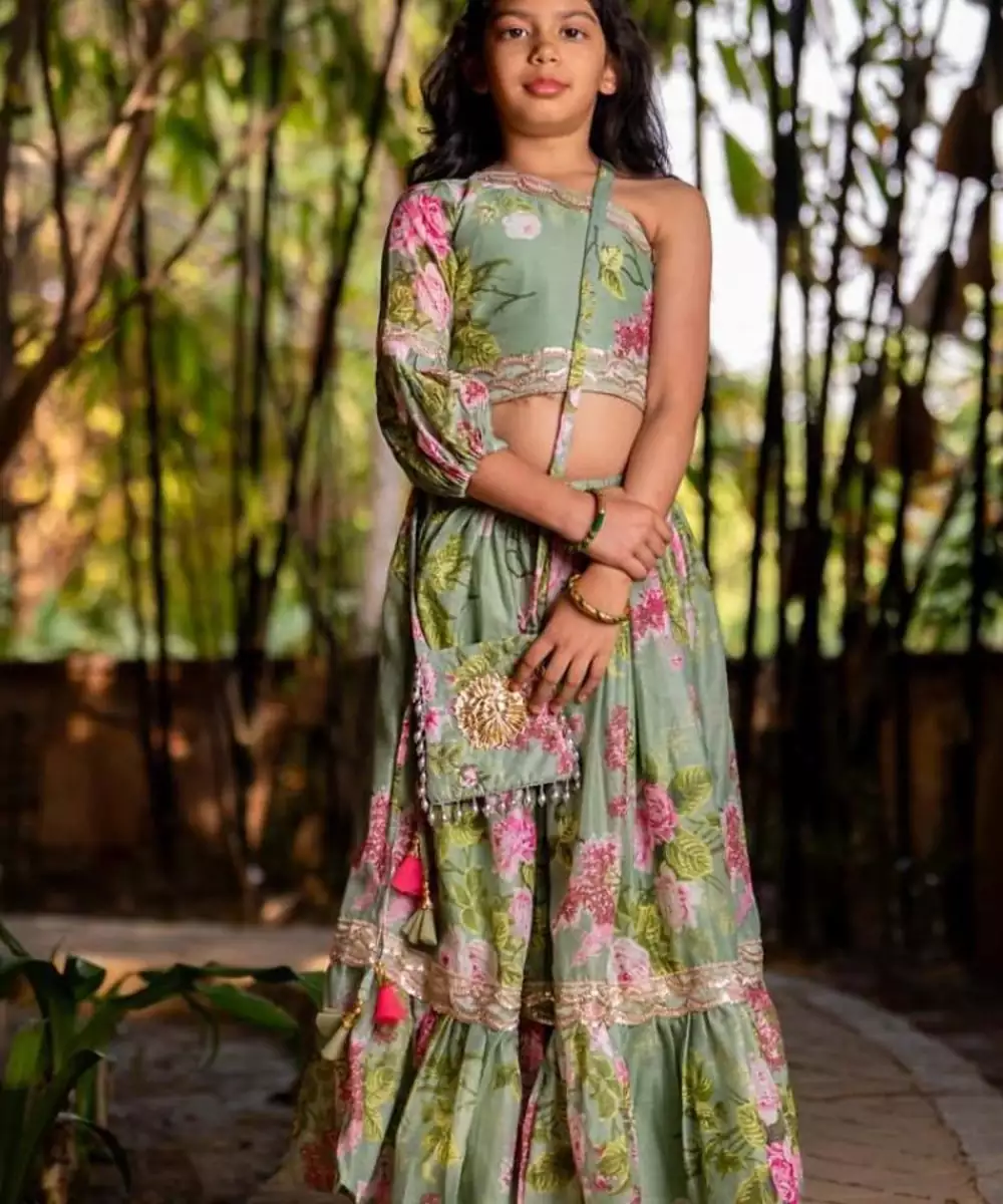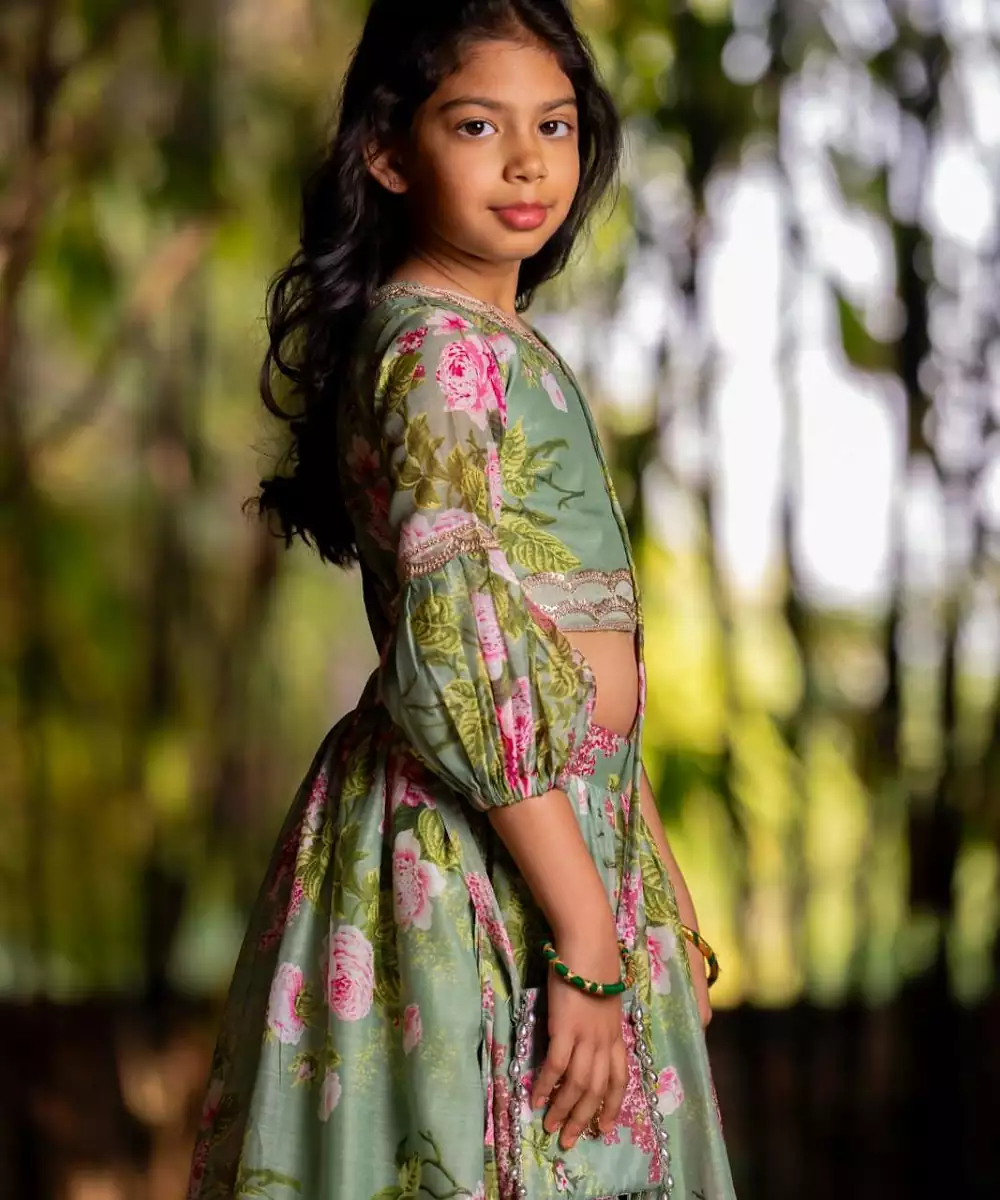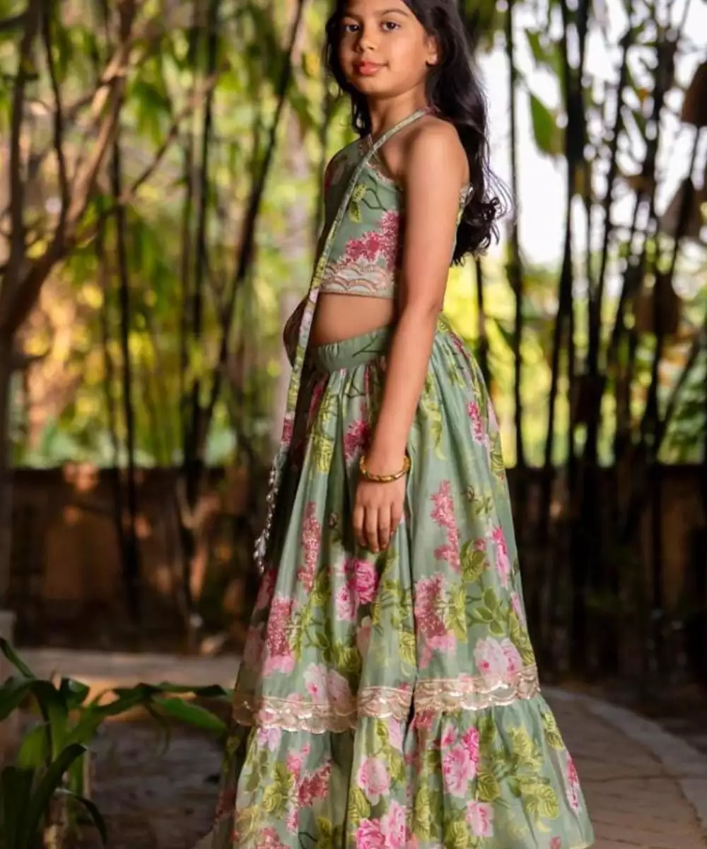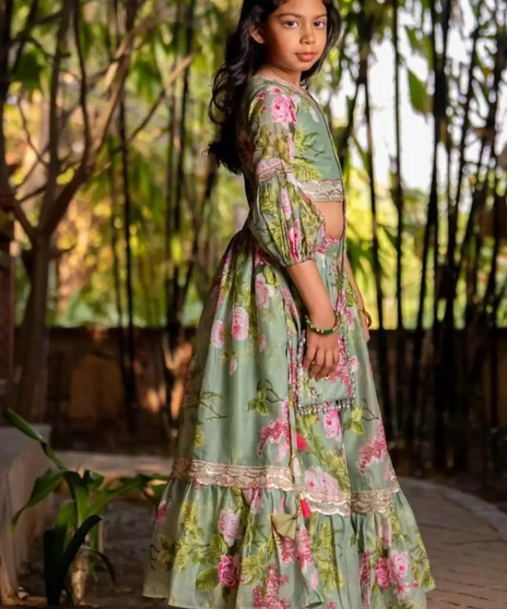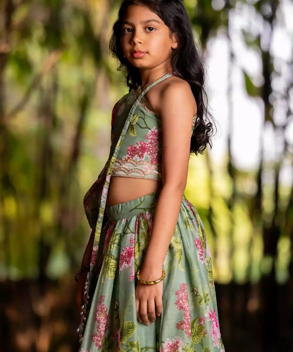 The Green Printed Chanderi Lehenga Set Is A Graceful Blend Of Tradition And Charm. Crafted From Lightweight Chanderi Fabric, The Lehenga Features Elegant Prints That Enhance Its Festive Appeal. Paired With A Matching Blouse And Dupatta, This Ensemble Is Perfect For Weddings, Festive Gatherings, Or Celebratory Occasions.