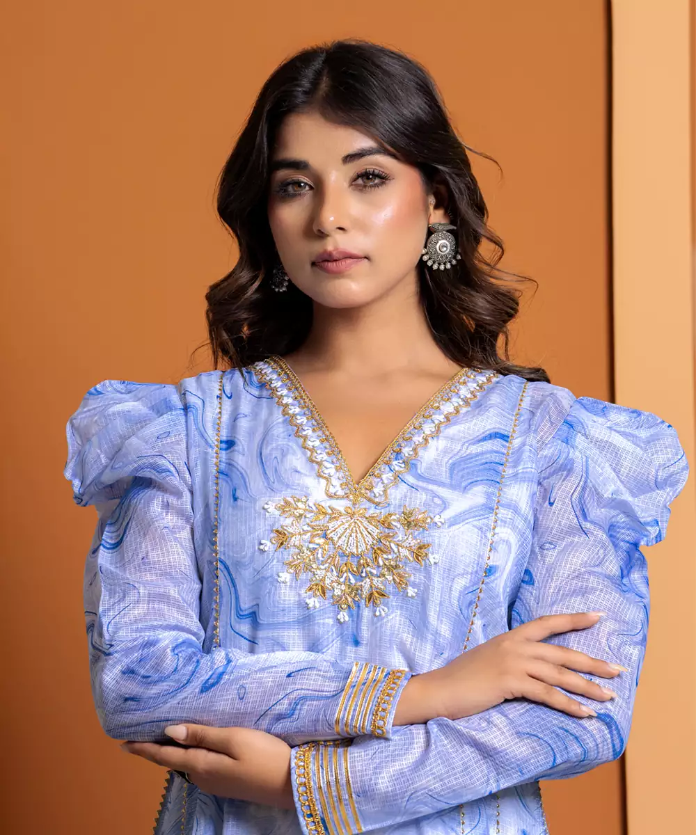 Featuring An Ivory & Blue Marble Print Pakistani Style Kurta In Doriya Base With Hand Embroidery. It Is Paired With Cotton Pants And A Matching Doriya Dupatta.
