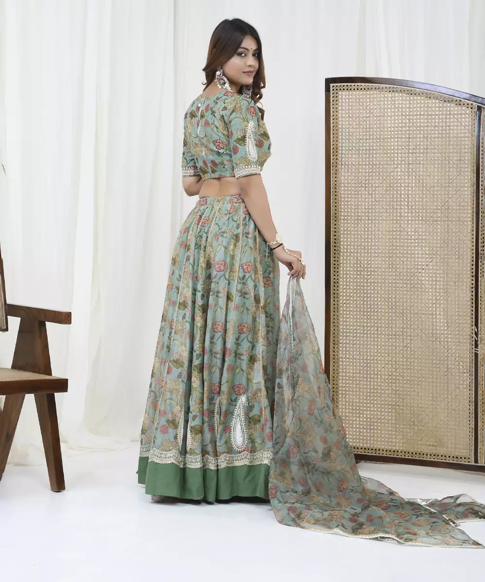Featuring A Mint Green Lehenga In Chanderi Base With Digital Print. It Is Paired With A Hand Embroidered Elbow Sleeves Blouse And A Matching Organza Dupatta. Accentuate With Statement Jewellery And Heels For A Wedding, Sangeet, Or Engagement Ceremony.