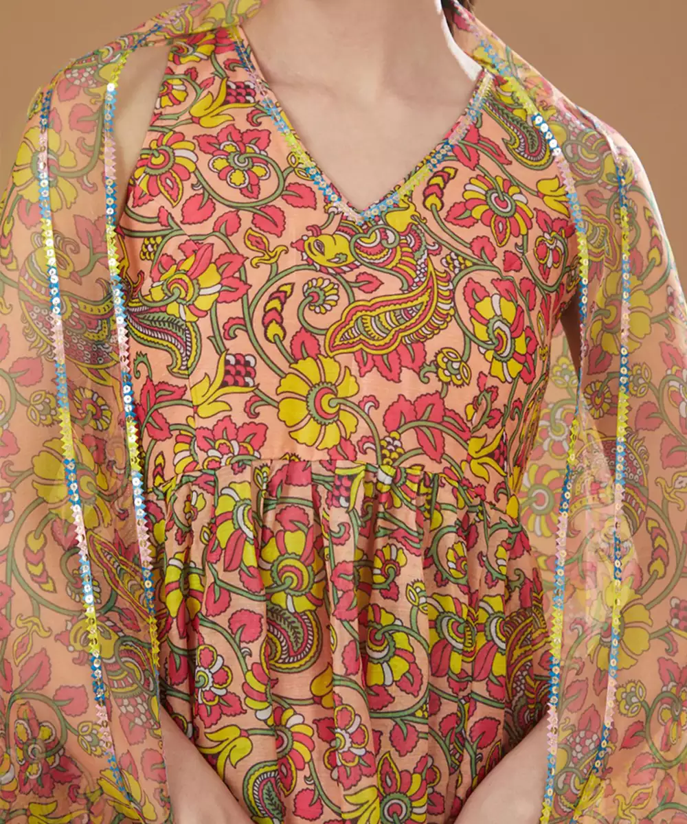 Featuring A Multi Color Anarkali In Chanderi Base With A Halter Neckline. It Is Paired With Matching Pants And An Organza Dupatta.
