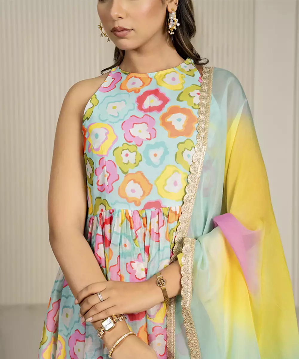 Featuring A Multi Colored Haulter Neck Anarkali In Chanderi Base With Floral Print And Lace Embroidery. It Is Paired With Pants And An Organza Dupatta. Style This Designer Anarkali Set With An Oxidised Jhumkas And Juttis For A Complete Festive Ready Look.