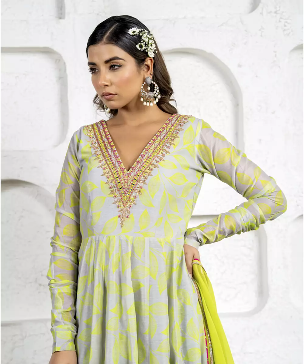Featuring A Neon Green & Grey Anarkali In Chanderi Base With Floral Print And Marori & Gota Work Embroidery. It Is Paired With Pants And An Organza Two Tone Dupatta. Style This Designer Anarkali Set With An Oxidised Jhumkas And Juttis For A Complete Festive Ready Look.