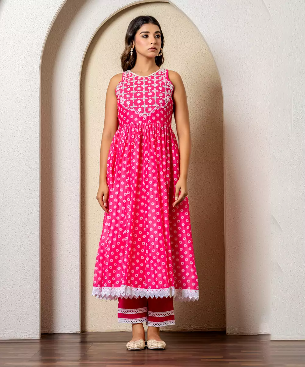 Featuring A Pink Anarkali In Printed Chanderi Base With Handcrafted Yoke, Cotton Pants. It Is Paired With A Matching Organza Dupatta.