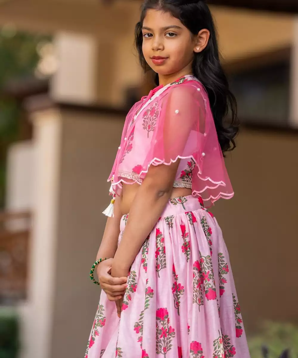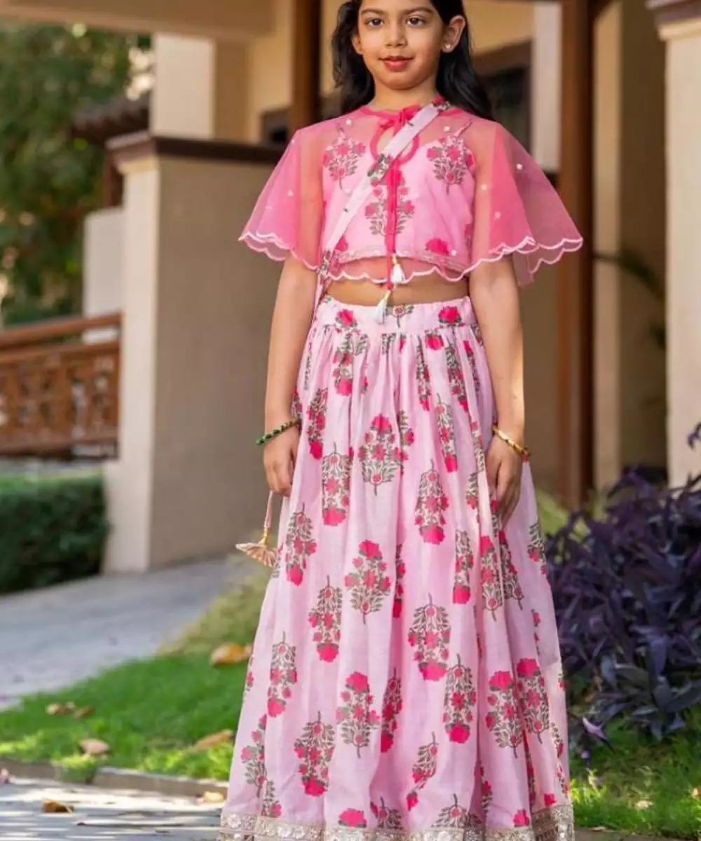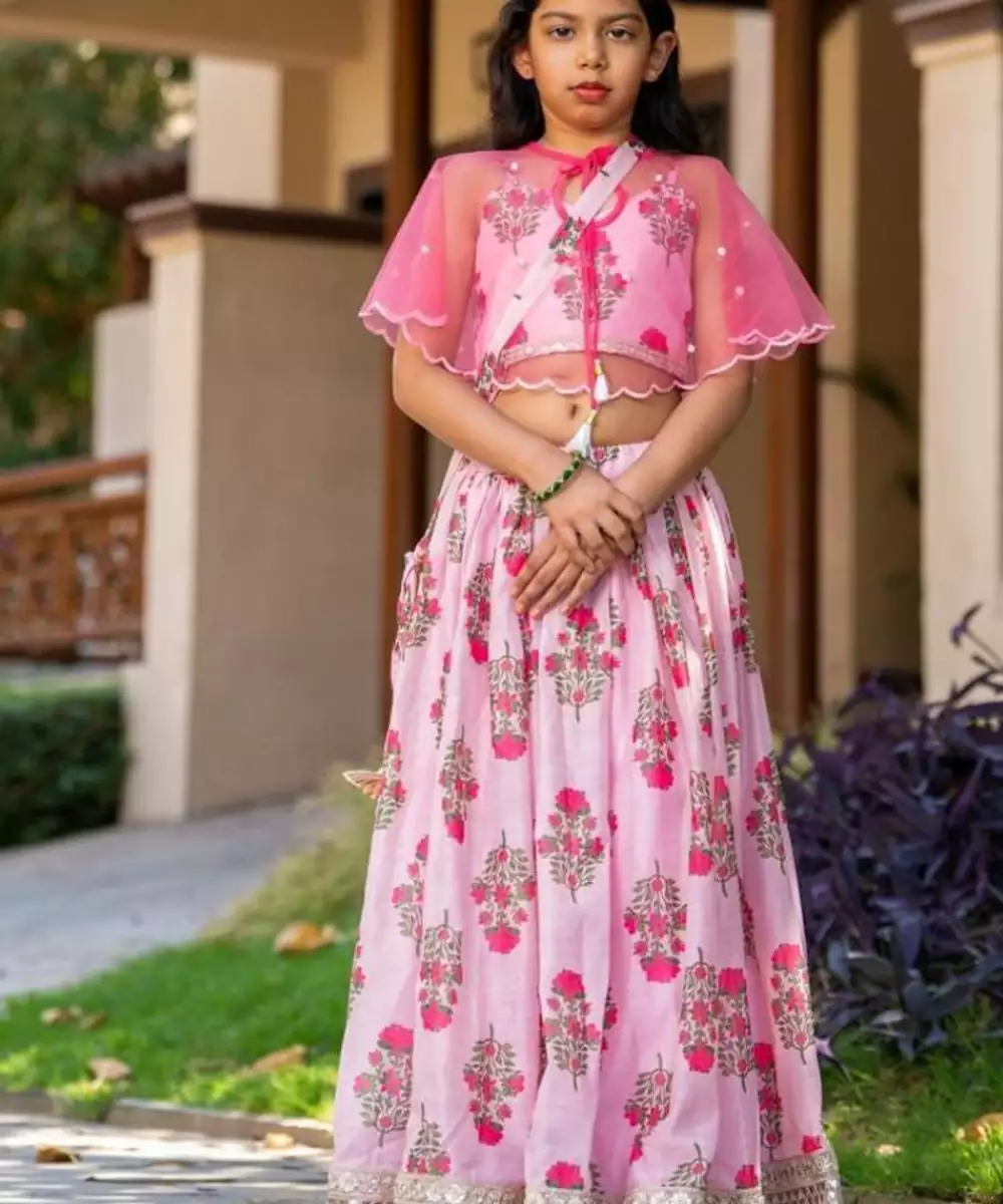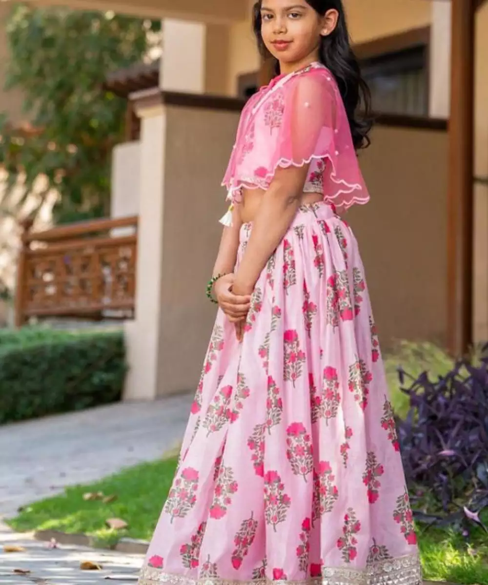 The Pink Printed Chanderi Lehenga Set Is A Graceful Blend Of Tradition And Charm. Crafted From Lightweight Chanderi Fabric, The Lehenga Features Elegant Prints That Enhance Its Festive Appeal. Paired With A Matching Blouse And Dupatta, This Ensemble Is Perfect For Weddings, Festive Gatherings, Or Celebratory Occasions.