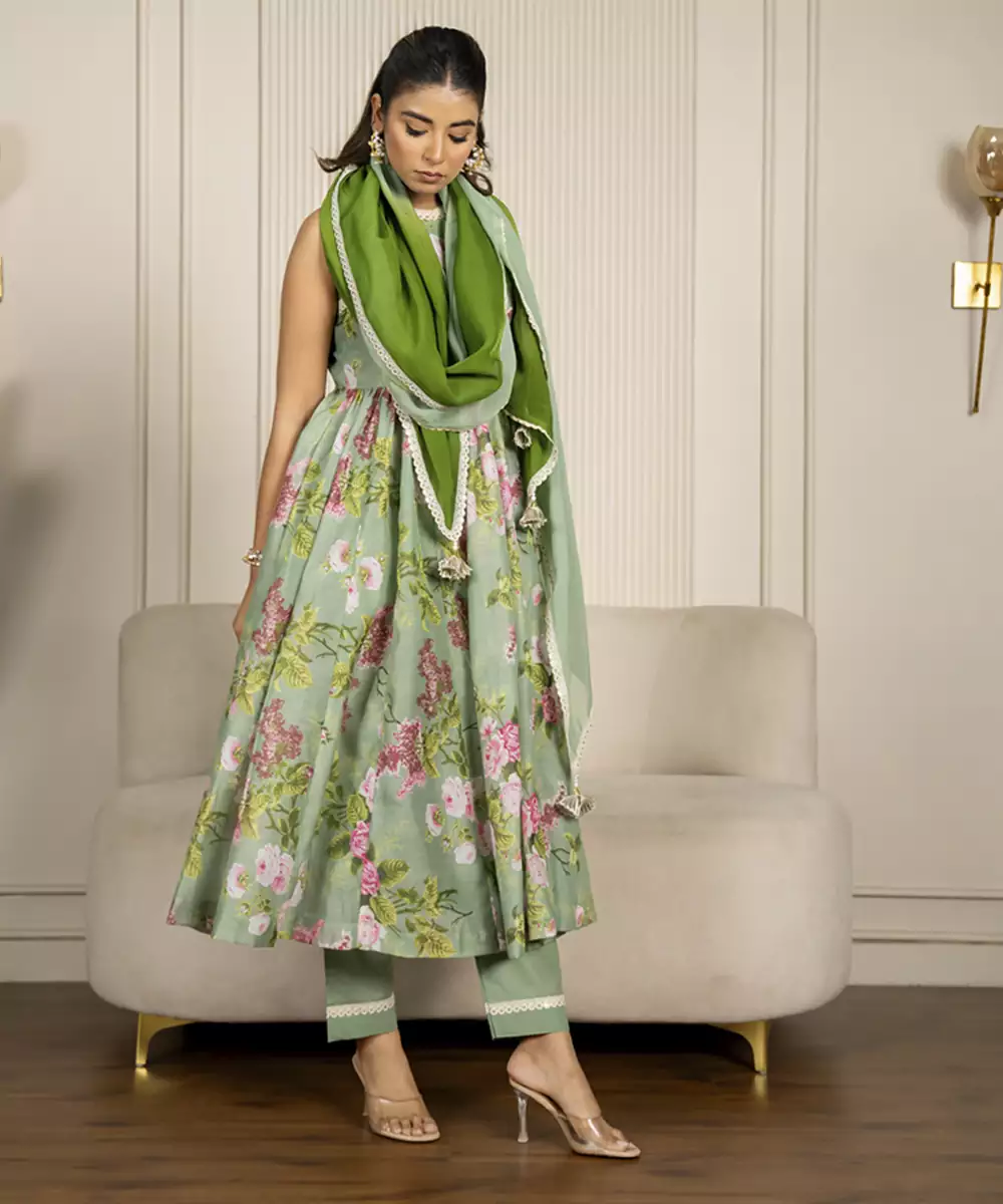 Featuring A Pista Green Haulter Neck Anarkali In Chanderi Base With Floral Print And Lace Embroidery. It Is Paired With Pants And An Organza Dupatta. Style This Designer Anarkali Set With An Oxidised Jhumkas And Juttis For A Complete Festive Ready Look.