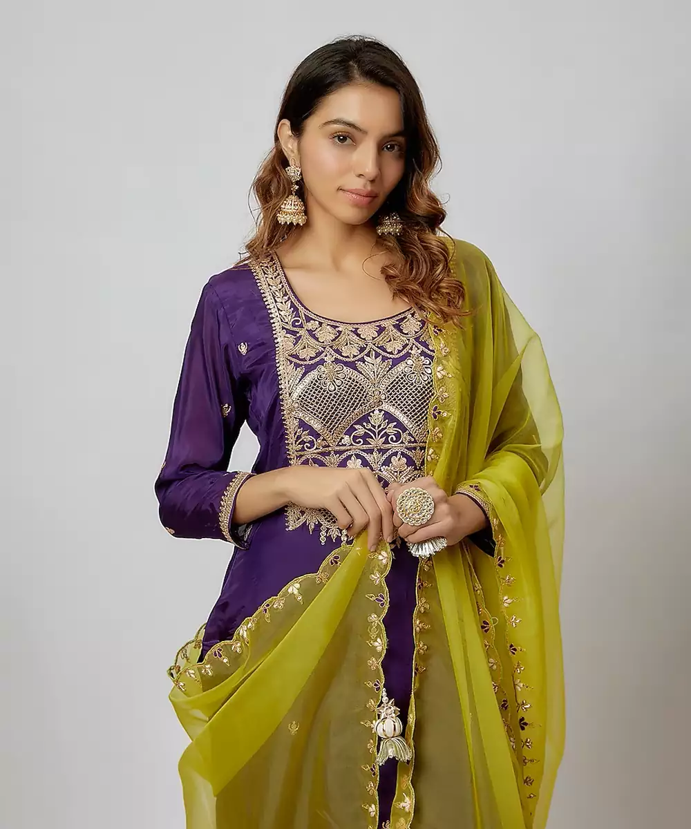 Featuring A Purple Kurta In Pure Spun Silk Base With Hand Embroidery. It Is Paired With Matching Pants And Contrast Green Organza Dupatta With Hand Embrodered Border.
