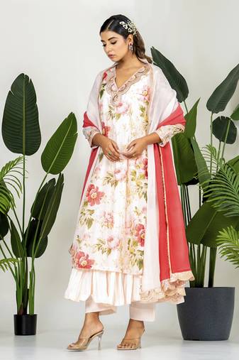 Featuring A Yellow Kurta In Chanderi Base With Digital Floral Print. It Is Paired With An Inner, Cotton Pants And An Organza Dupatta. Accentuate It With Chandbali Earrings And Juttis For A Festive Ready Look.
