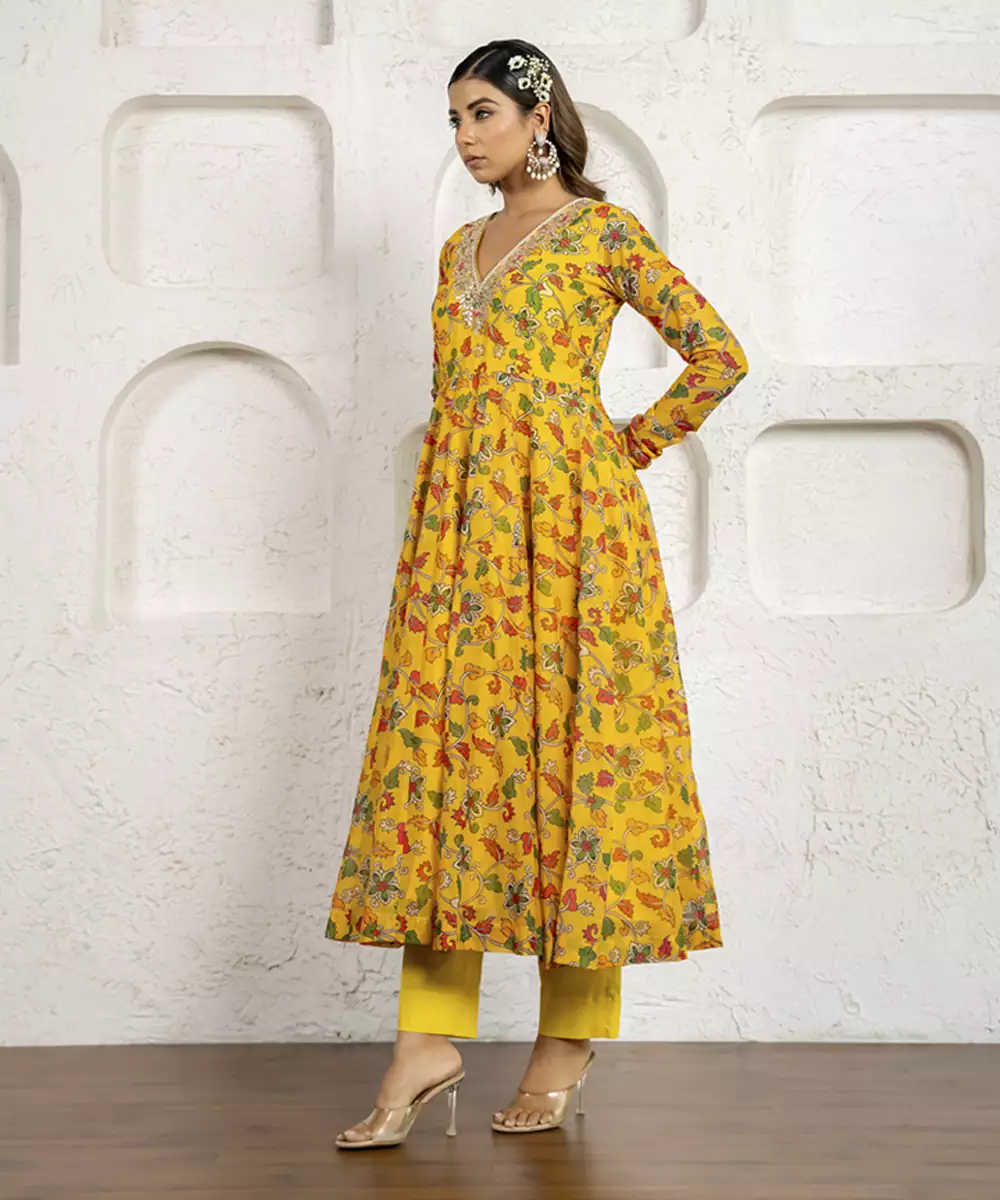 Featuring A Yellow Ananarkali In Chanderi Base With Churidar Sleeves, Floral Print And Marori & Gota Work. It Is Paired With Pants And An Organza Dupatta, Including An Embroidered Belt. Style This Designer Anarkali Set With An Oxidised Jhumkas And Juttis For A Complete Festive Ready Look.