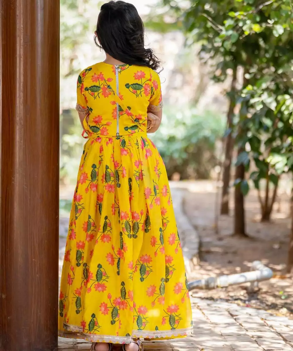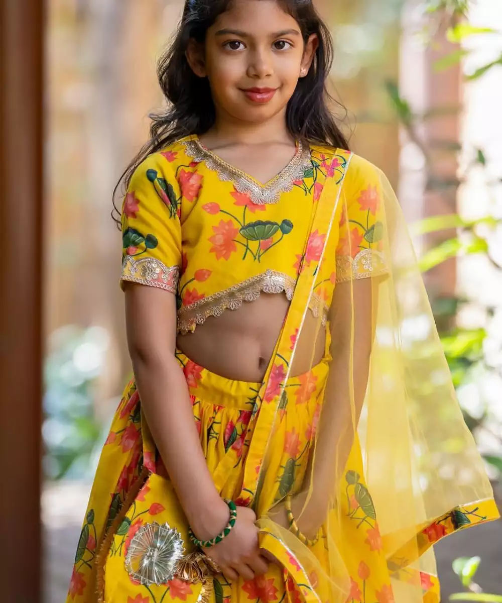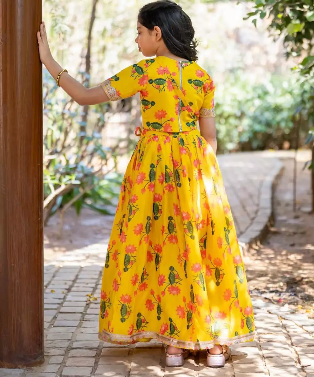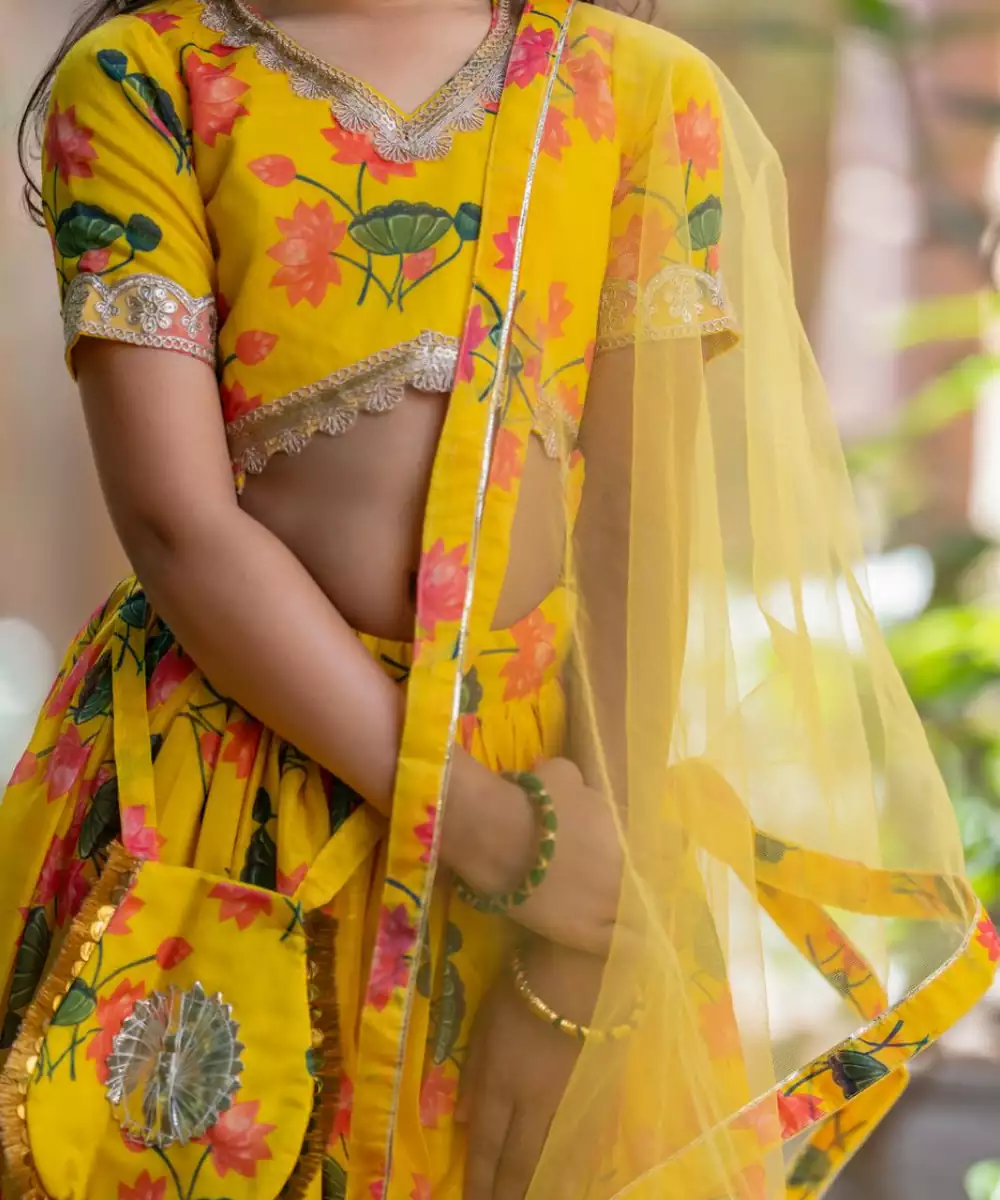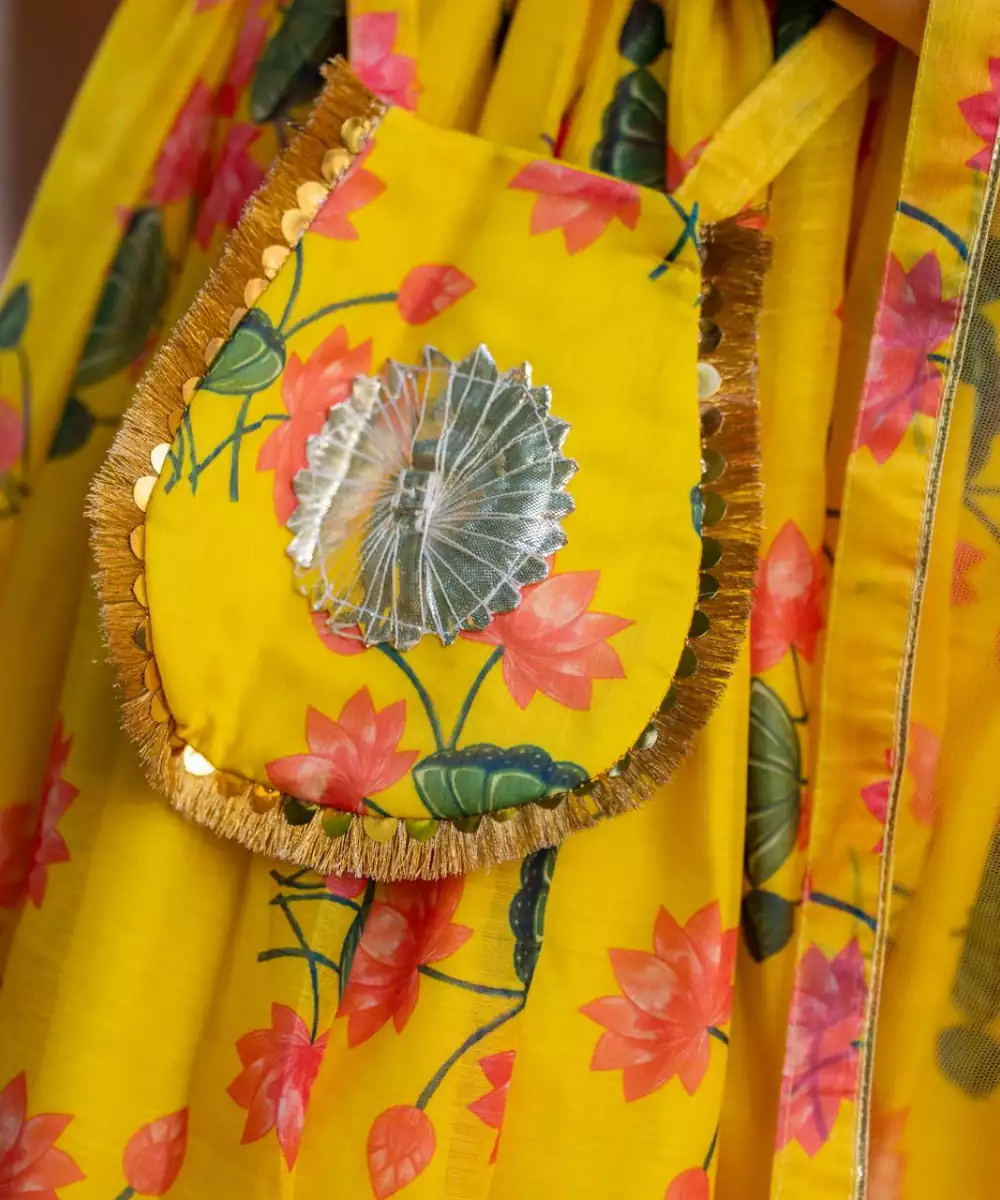 The Yellow Printed Chanderi Lehenga Set Is A Graceful Blend Of Tradition And Charm. Crafted From Lightweight Chanderi Fabric, The Lehenga Features Elegant Prints That Enhance Its Festive Appeal. Paired With A Matching Blouse And Dupatta, This Ensemble Is Perfect For Weddings, Festive Gatherings, Or Celebratory Occasions.