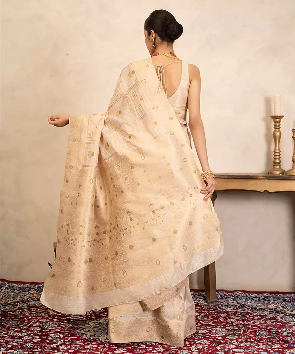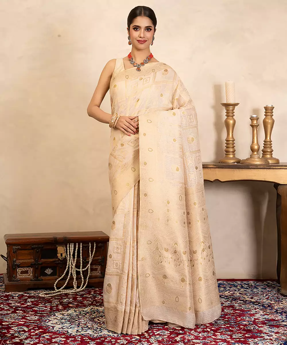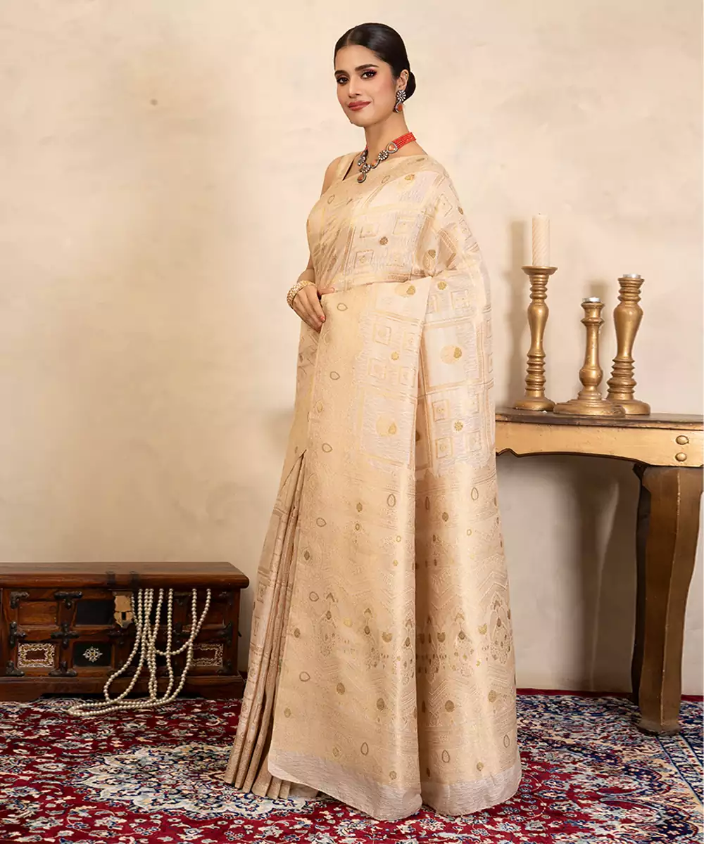 This Beige Pure Silk Saree Features A Smooth Texture And Elegant Drape, Crafted With Precision. Its Neutral Tone Offers Versatility For Various Occasions. Style It With Statement Accessories To Elevate Its Charm And Create A Refined, Timeless Ensemble With Understated Sophistication.