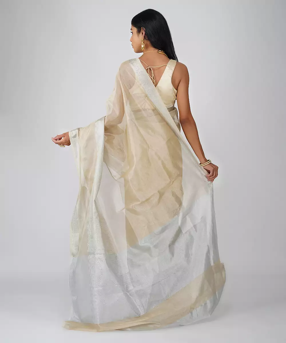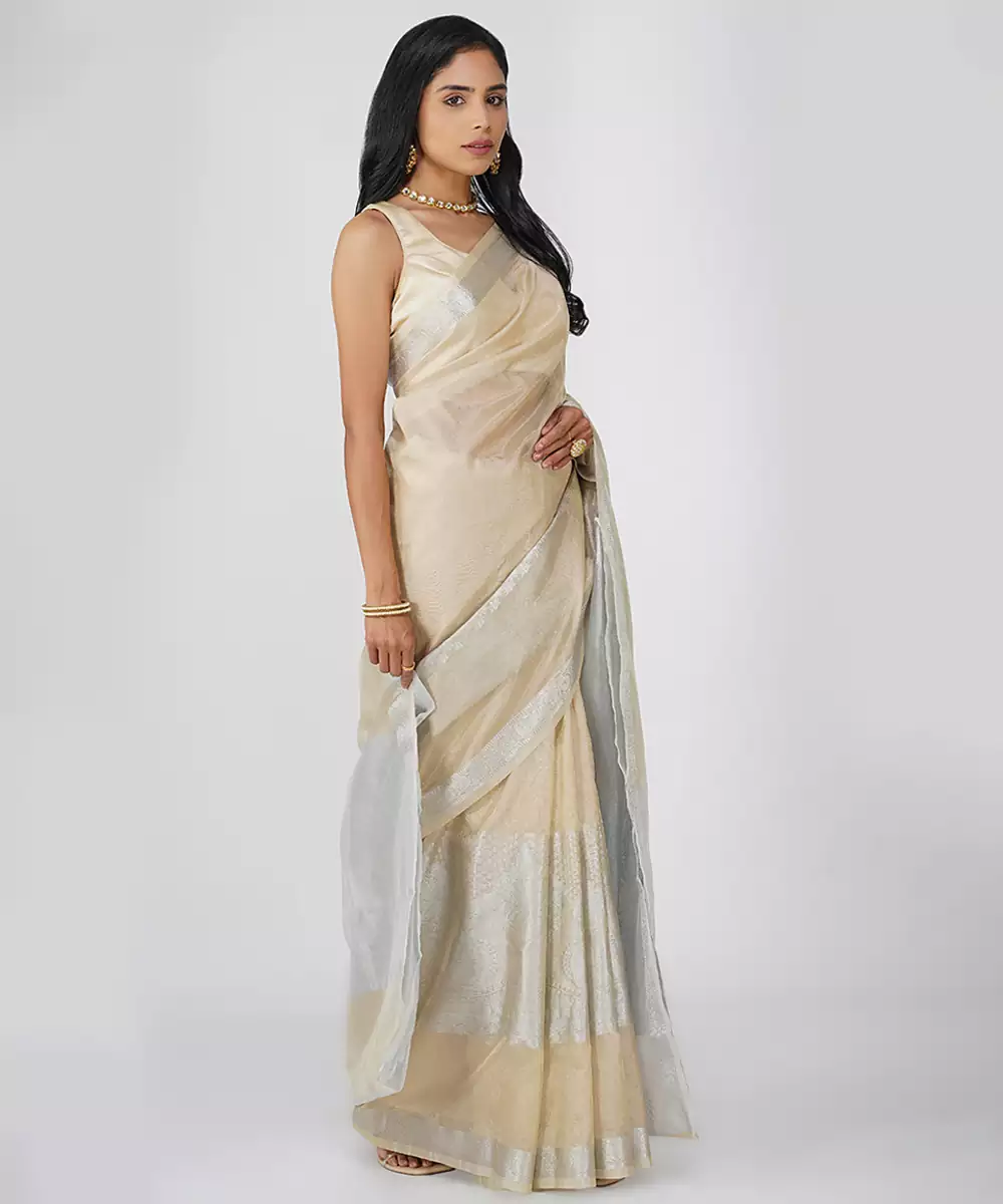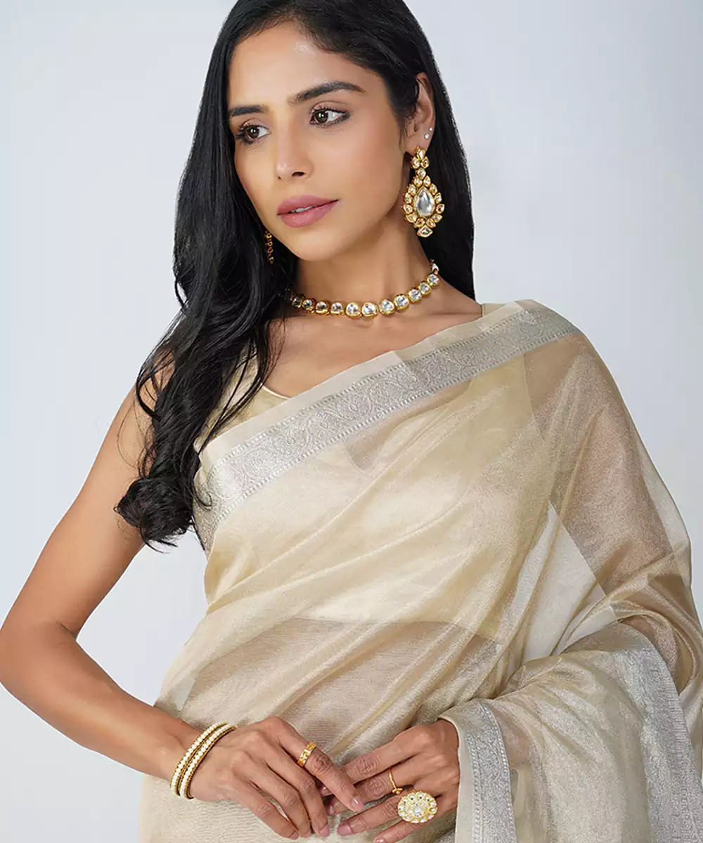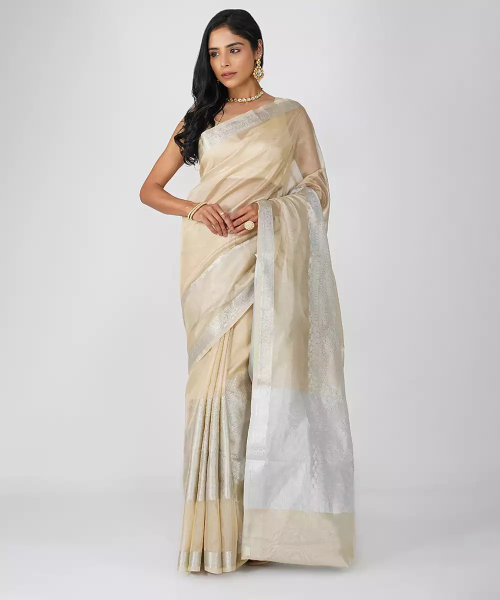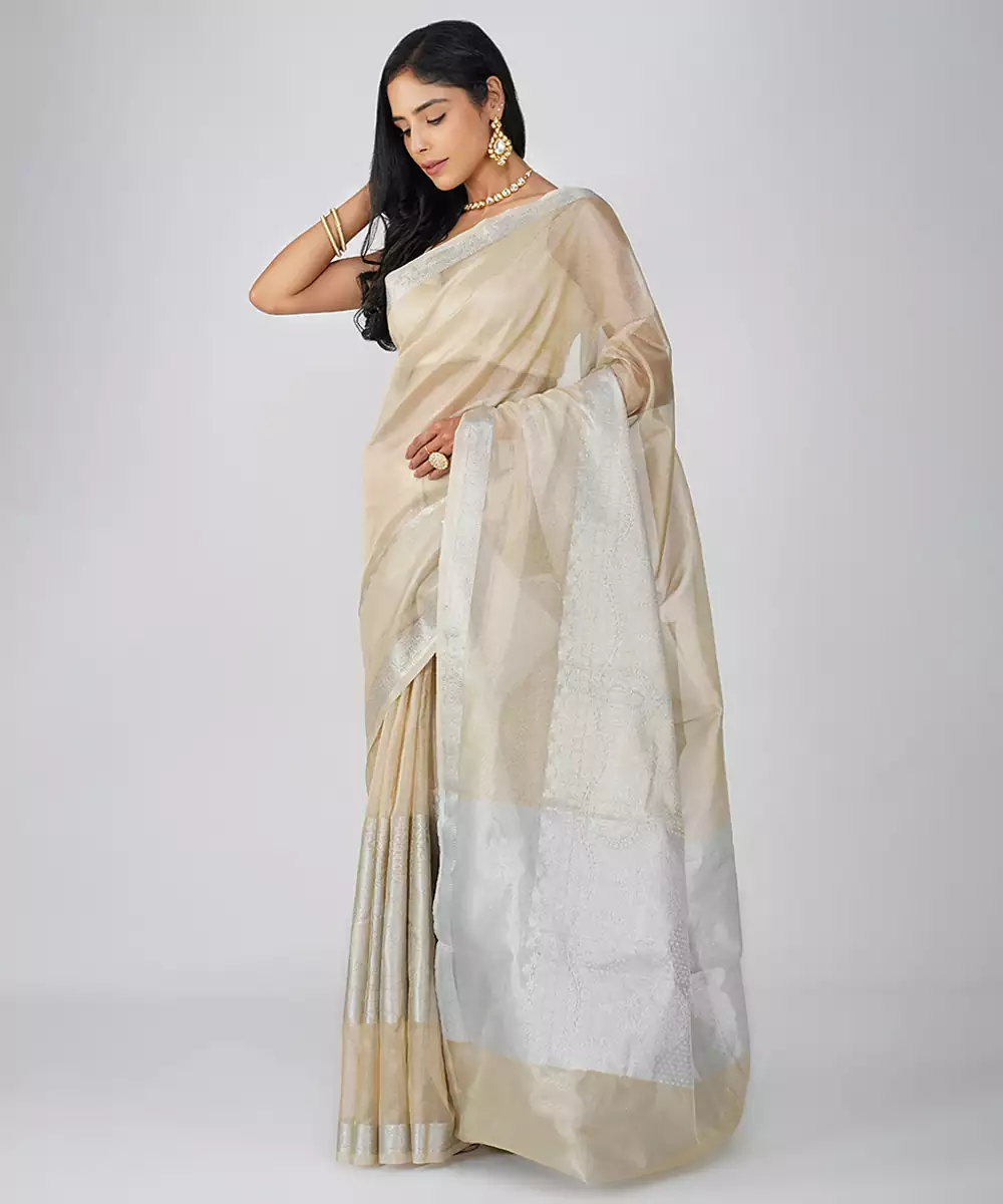 This Beige Tissue Silk Saree Features A Subtle Sheen And Lightweight Feel, Crafted With Intricate Handloom Techniques. Its Soft Tone And Elegant Drape Make It Perfect For Daytime Events Or Festive Occasions. Style It With Delicate Accessories For A Refined And Graceful Appearance.