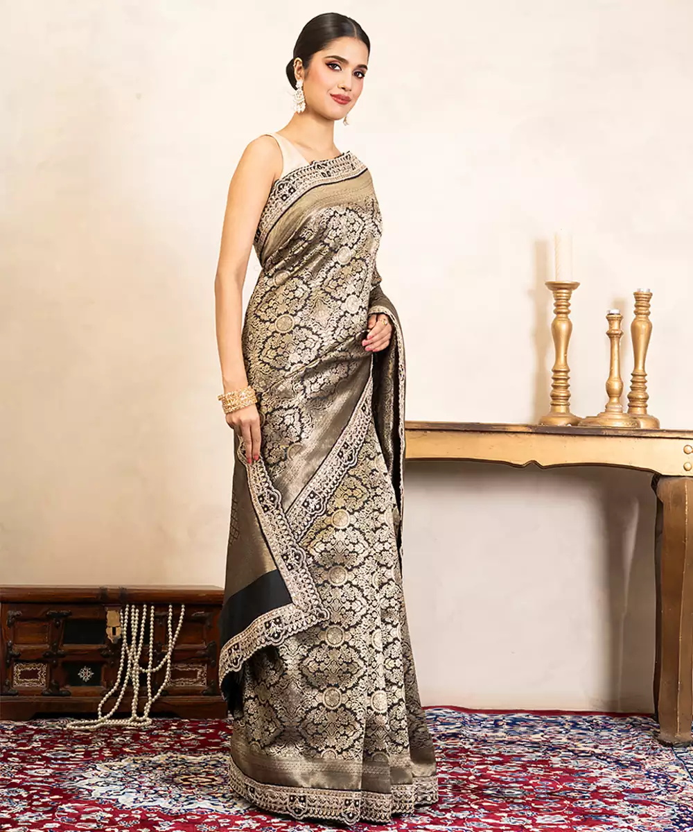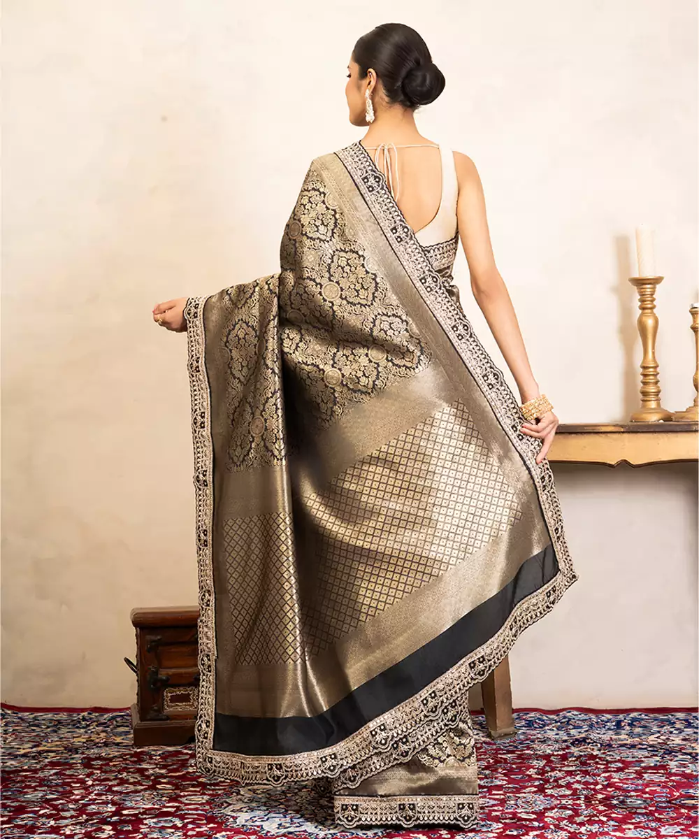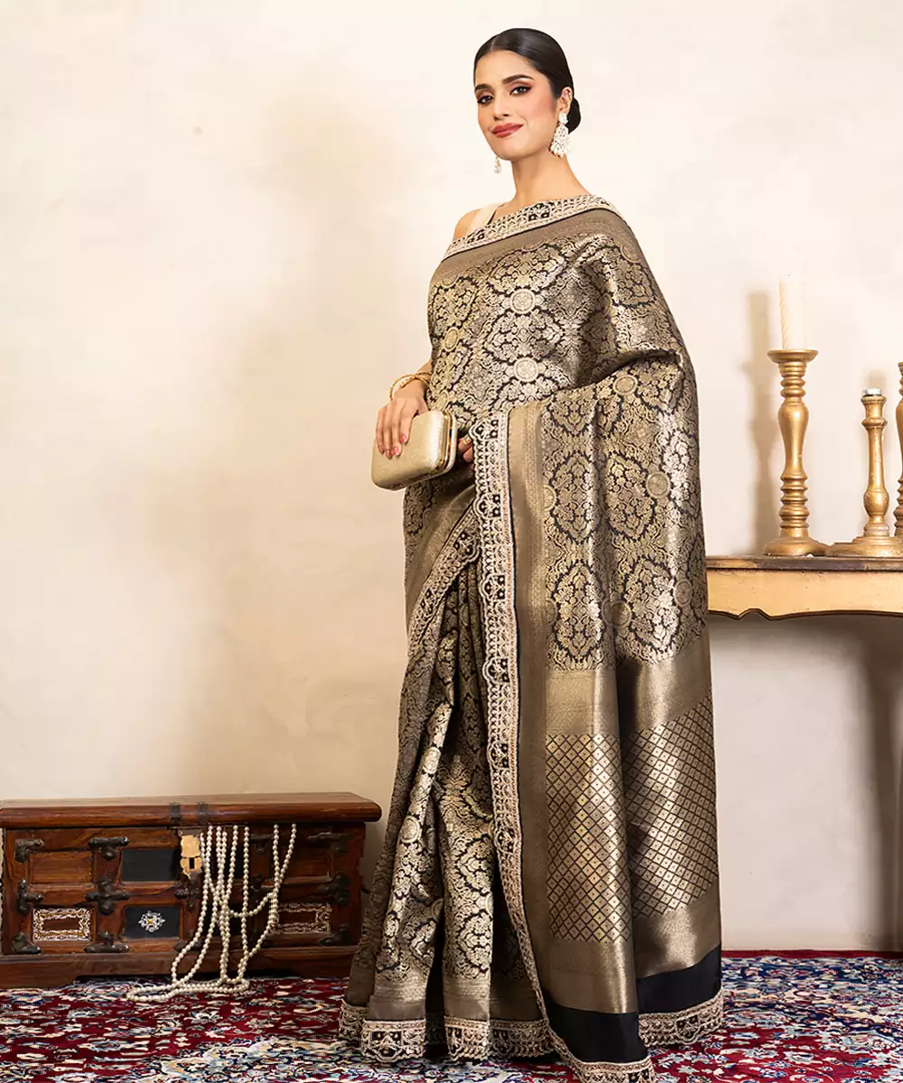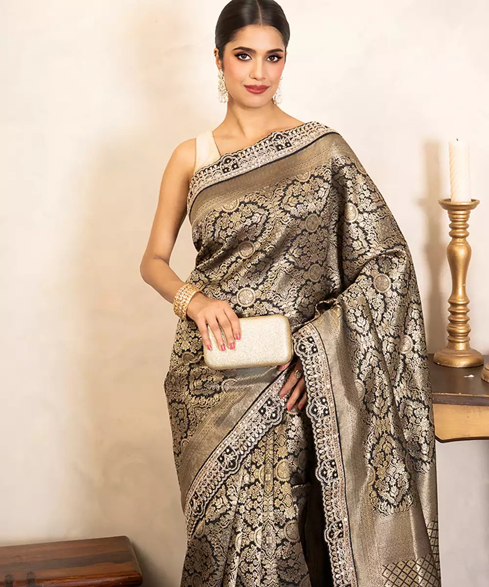 This Black Brocade Banarasi Saree Features Intricate Woven Designs With A Rich, Textured Finish. Crafted Using Traditional Handloom Techniques, It Exudes Elegance And Grandeur. Perfect For Special Occasions, It Pairs Beautifully With Statement Jewelry To Create A Bold, Regal, And Timeless Look.