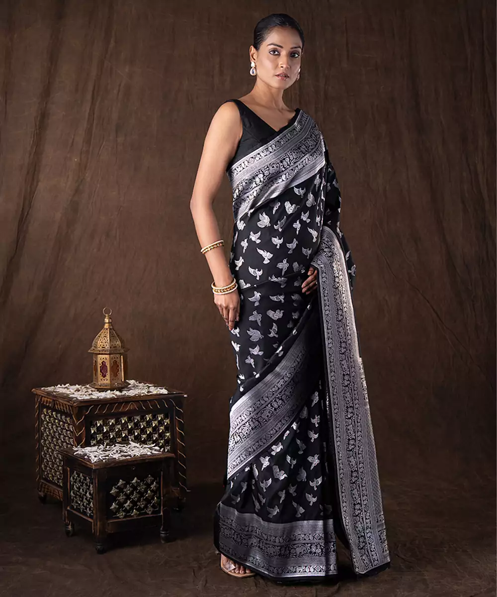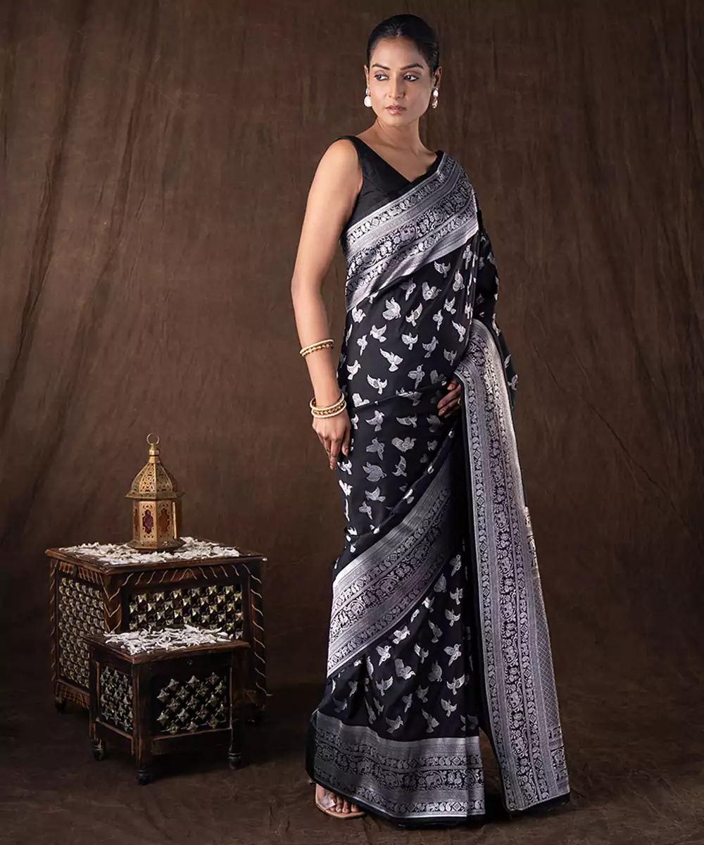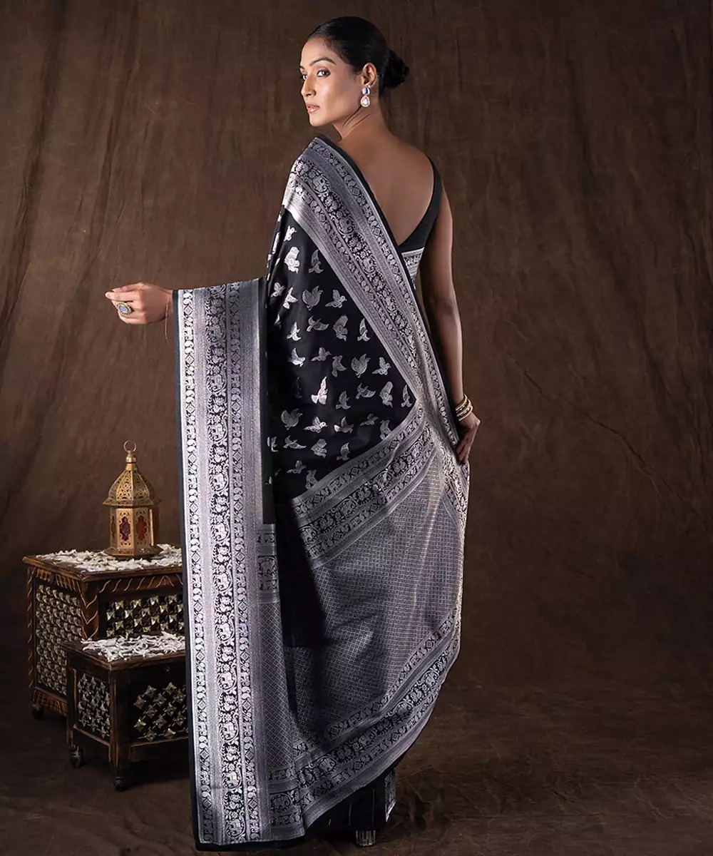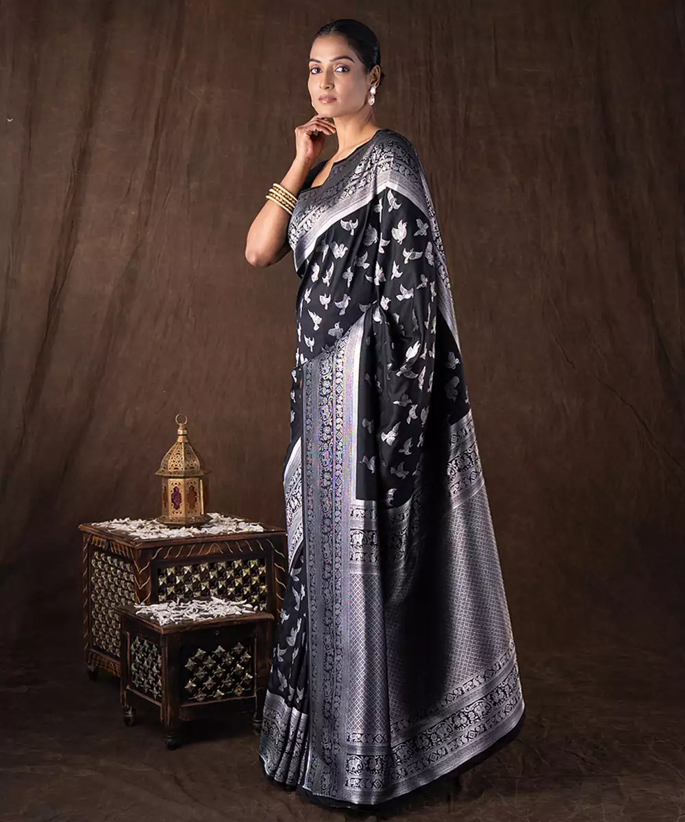 This Black Pure Silk Saree Exudes Understated Elegance With Its Rich Texture And Graceful Drape. Crafted Using Traditional Handloom Techniques, It Is Perfect For Formal And Festive Occasions. Pair It With Bold Jewelry To Create A Striking, Sophisticated Look That Remains Timeless And Effortlessly Stylish.