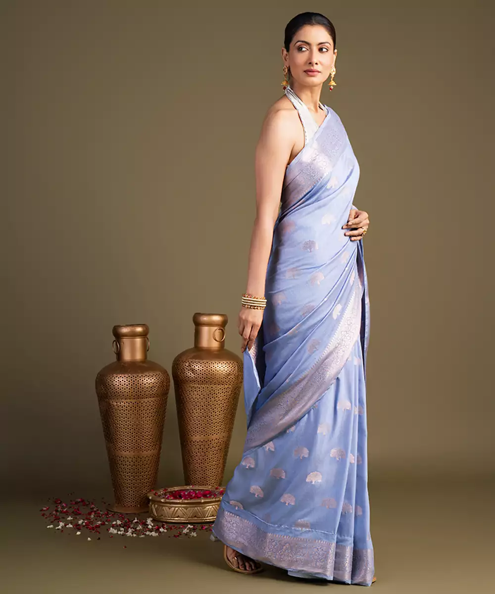 This Blue Banarasi Silk Saree Highlights Exquisite Handwoven Detailing That Reflects Traditional Craftsmanship. Its Luxurious Texture And Graceful Drape Make It Ideal For Weddings And Celebrations. Style It With Classic Accessories To Create A Timeless And Elegant Ensemble Effortlessly.