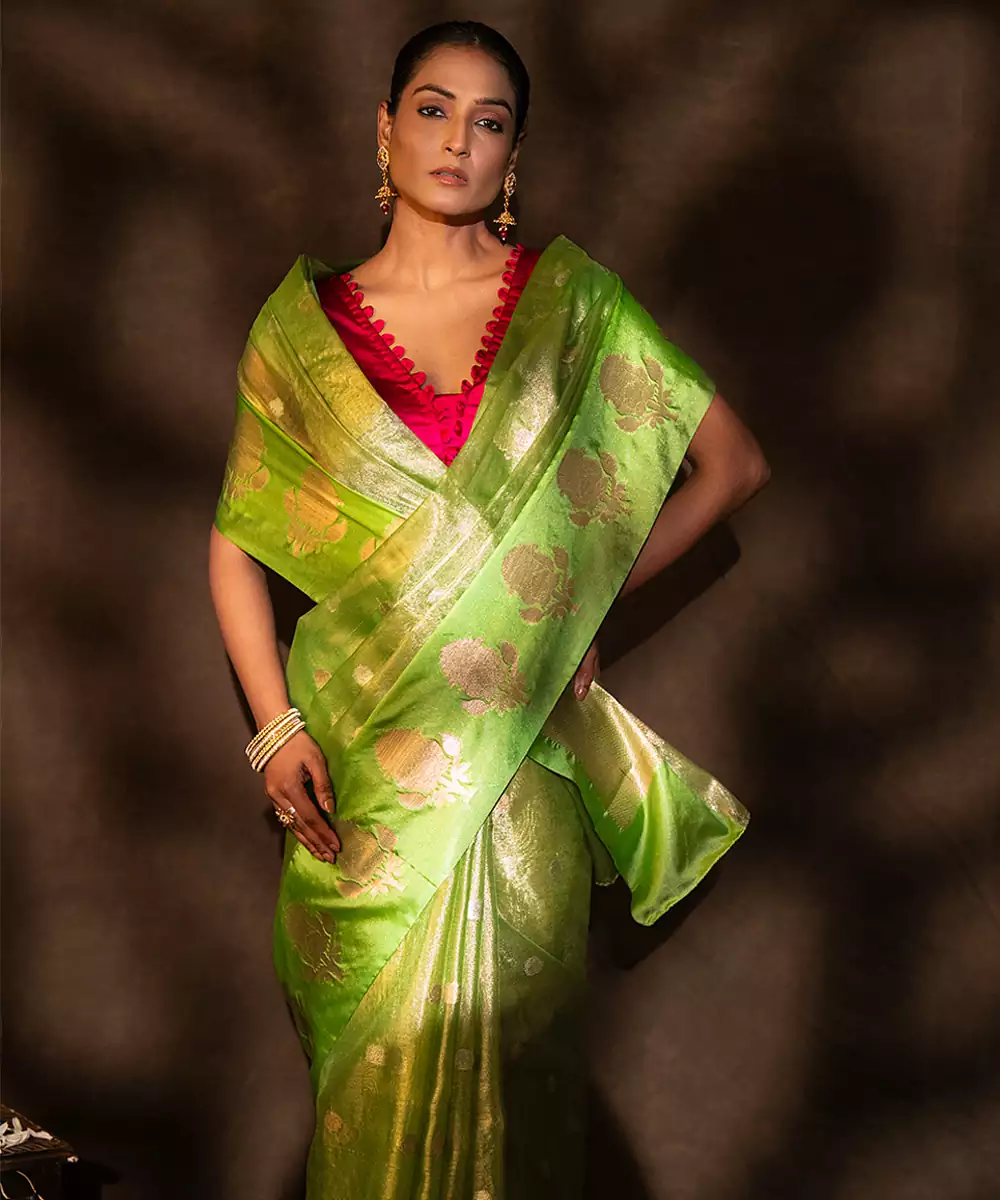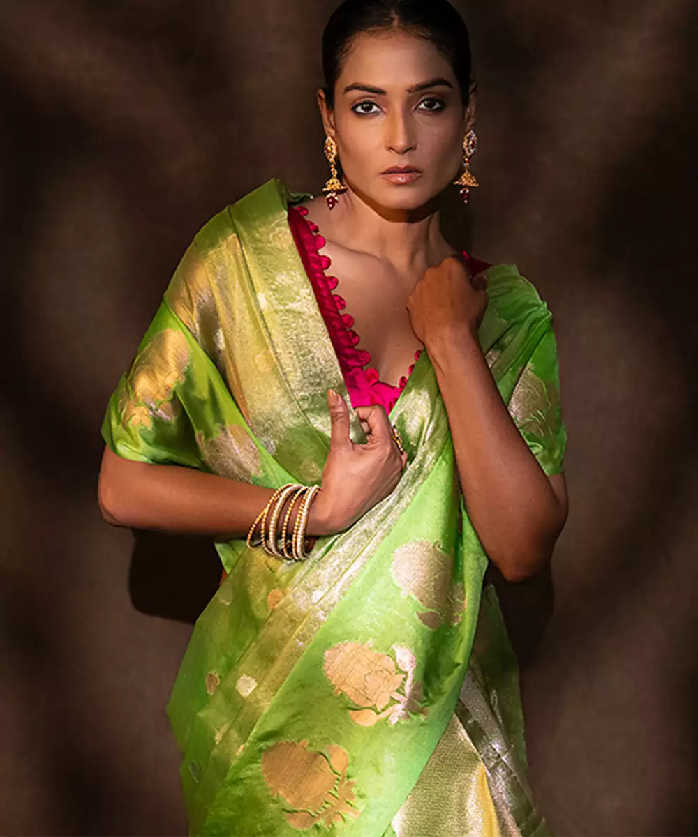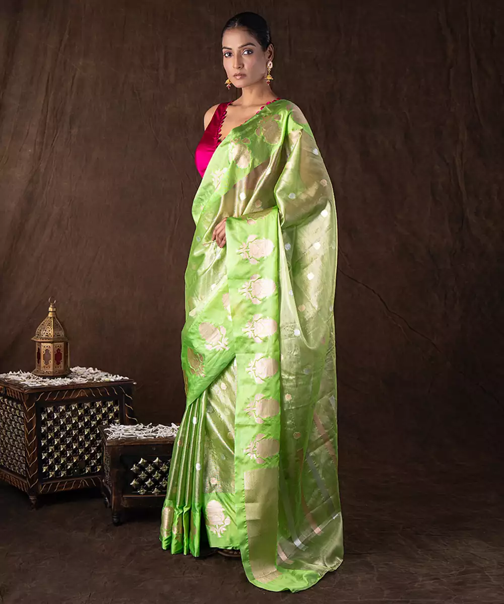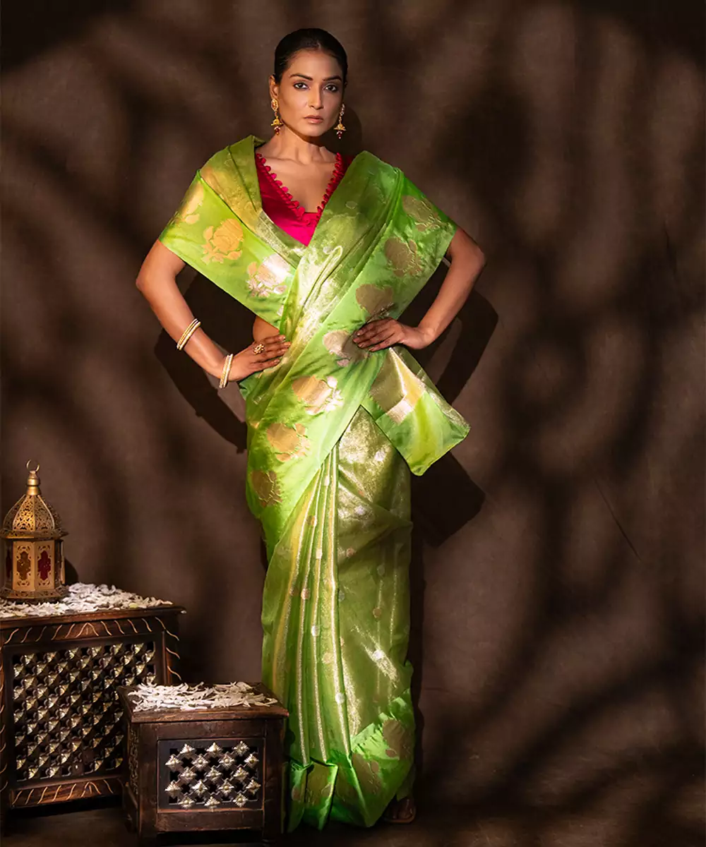 This Green Tissue Silk Saree Features A Subtle Shimmer And Lightweight Feel, Crafted With Fine Handloom Artistry. Its Elegant Drape And Luminous Finish Make It Perfect For Festive Occasions. Style It With Statement Accessories To Create A Vibrant And Graceful Look With Contemporary Charm.