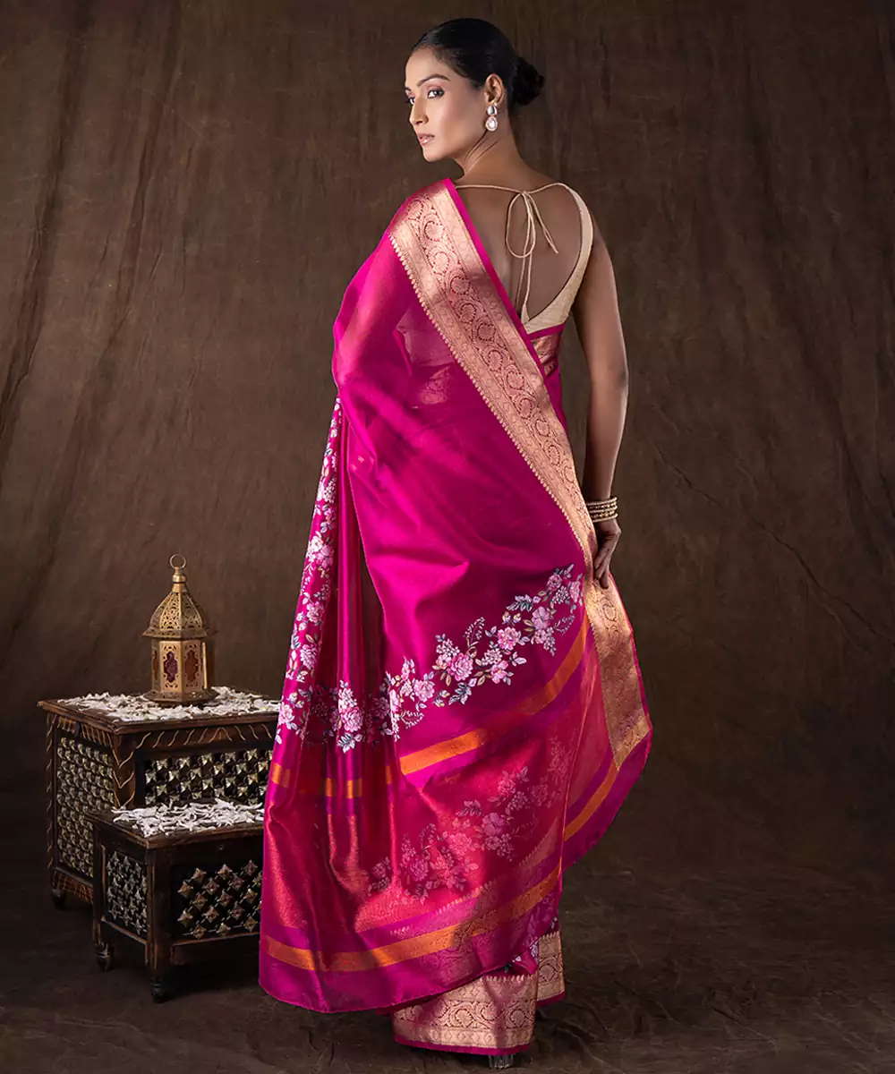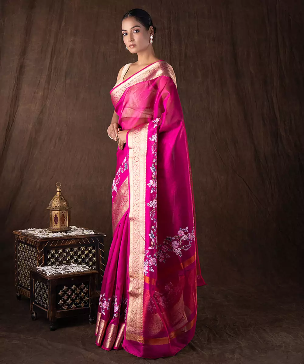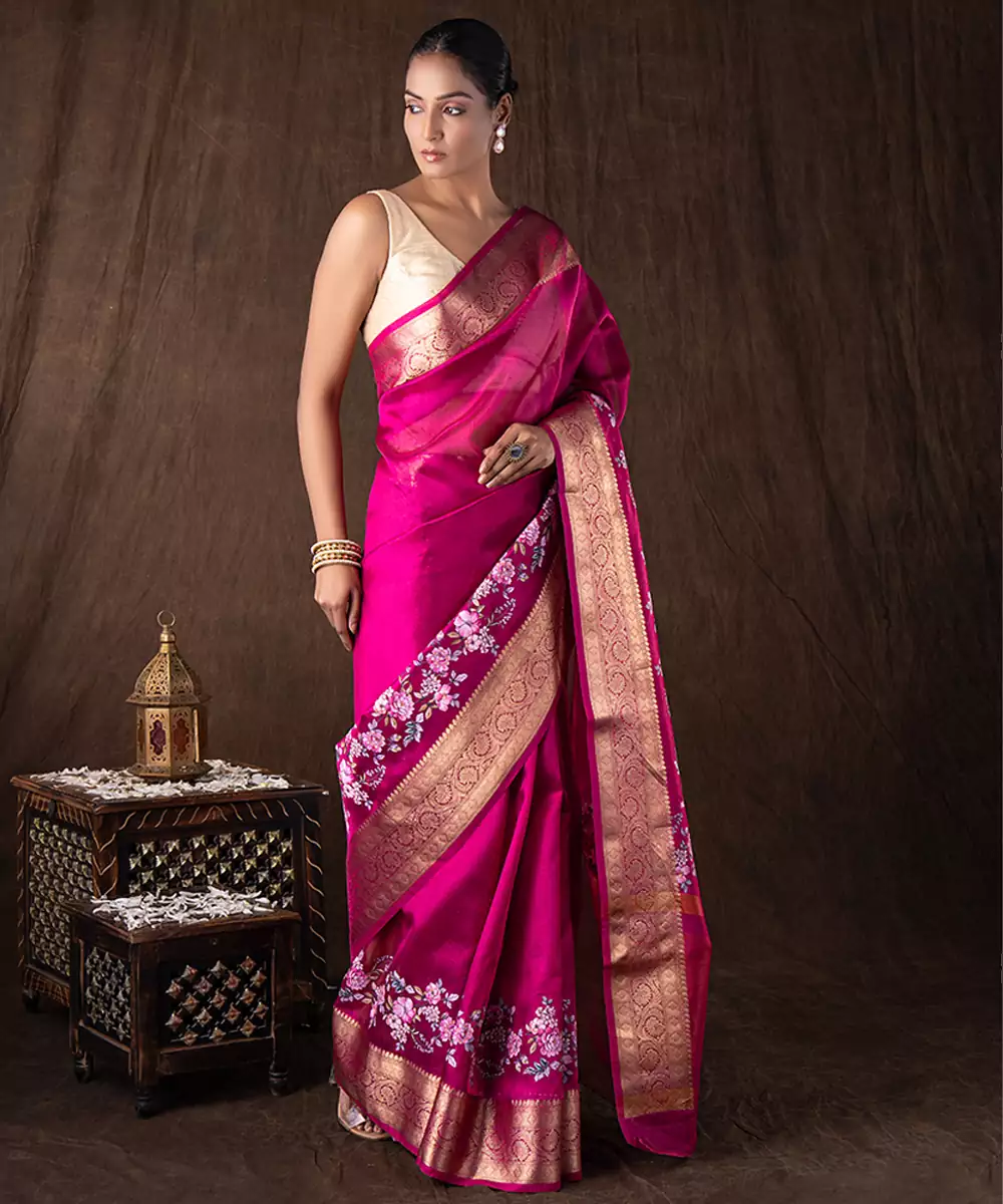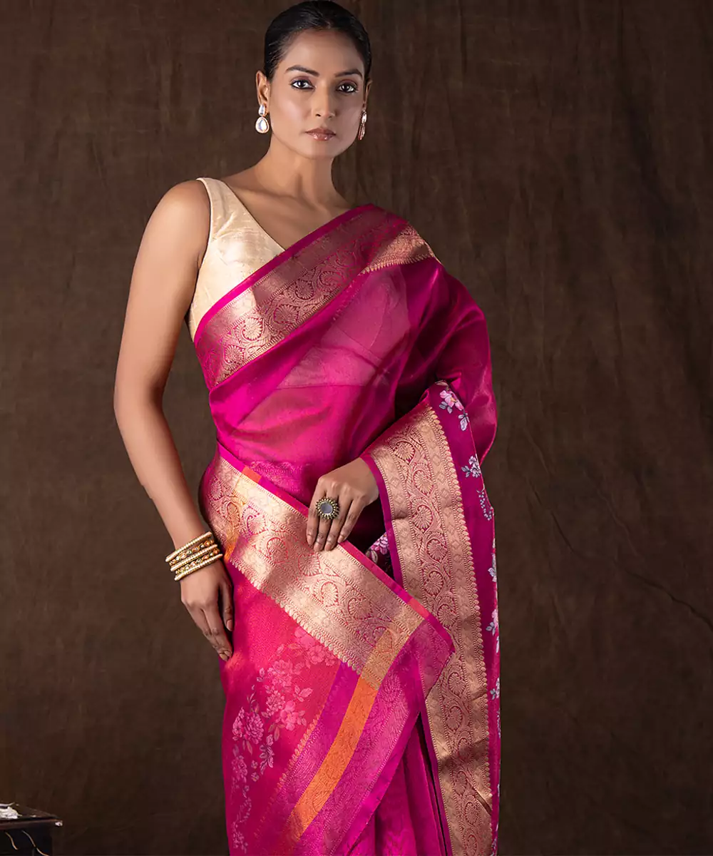 This Magenta Tissue Silk Saree Features A Luminous Finish And Delicate Handloom Craftsmanship. Its Lightweight Texture Offers Comfort While Maintaining A Festive Shine. Perfect For Special Occasions, It Pairs Beautifully With Elegant Jewelry, Creating A Vibrant And Graceful Look That Stands Out With Subtle Shimmer And Sophistication.
