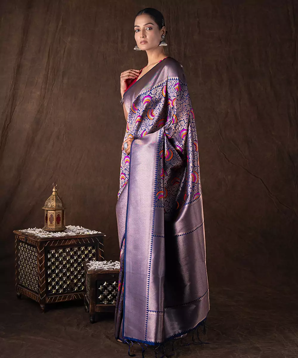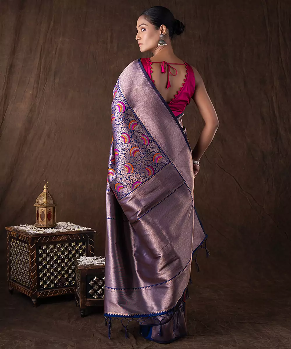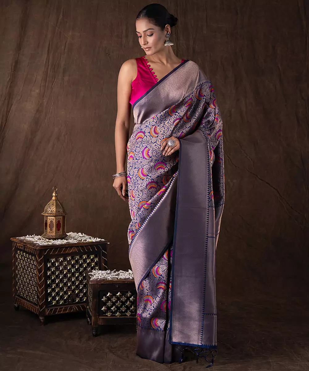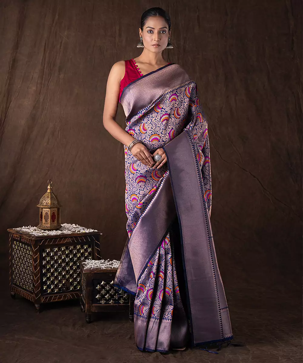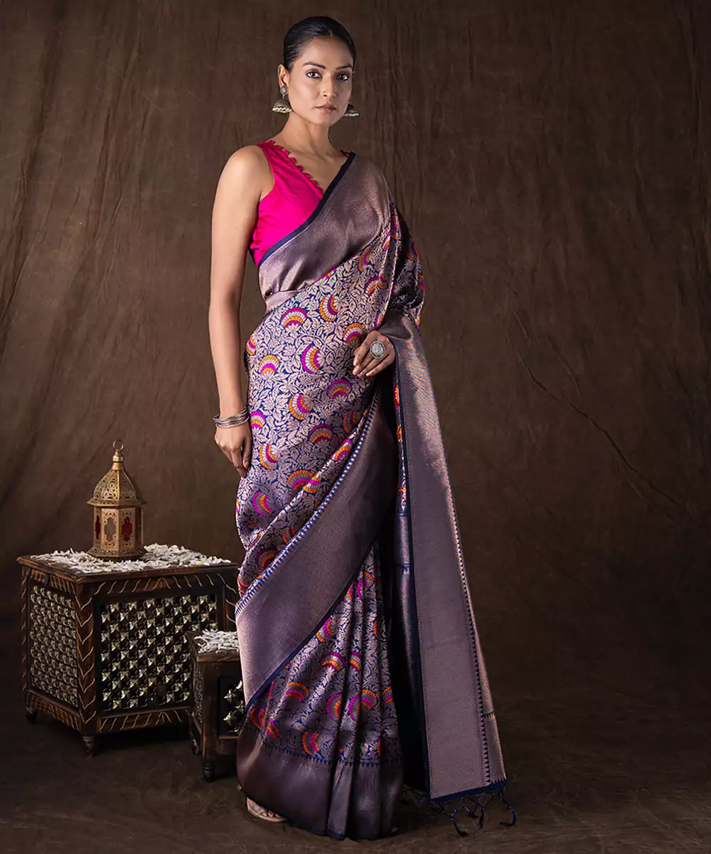 Crafted In Rich Navy Blue Kanchipuram Silk, This Saree Features Traditional Handwoven Patterns That Reflect Heritage Artistry. Its Luxurious Texture And Structured Drape Make It Perfect For Grand Celebrations. Style It With Classic Gold Jewelry For A Regal And Timeless Look That Exudes Elegance And Sophistication.
