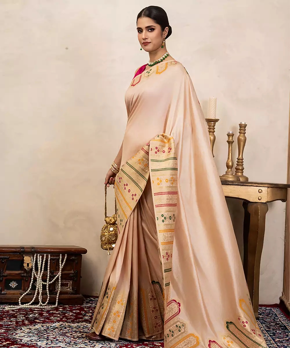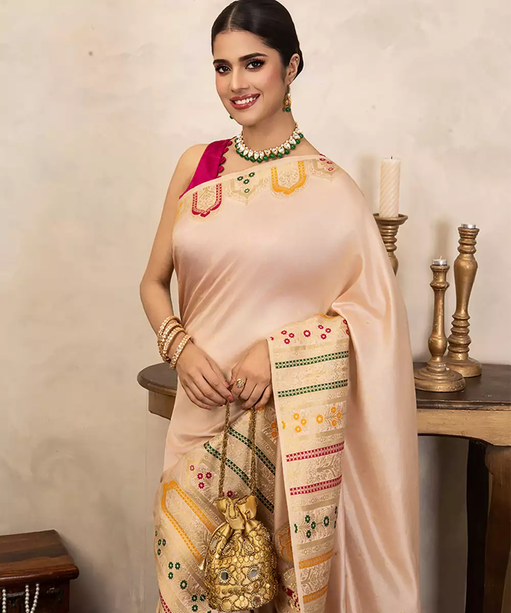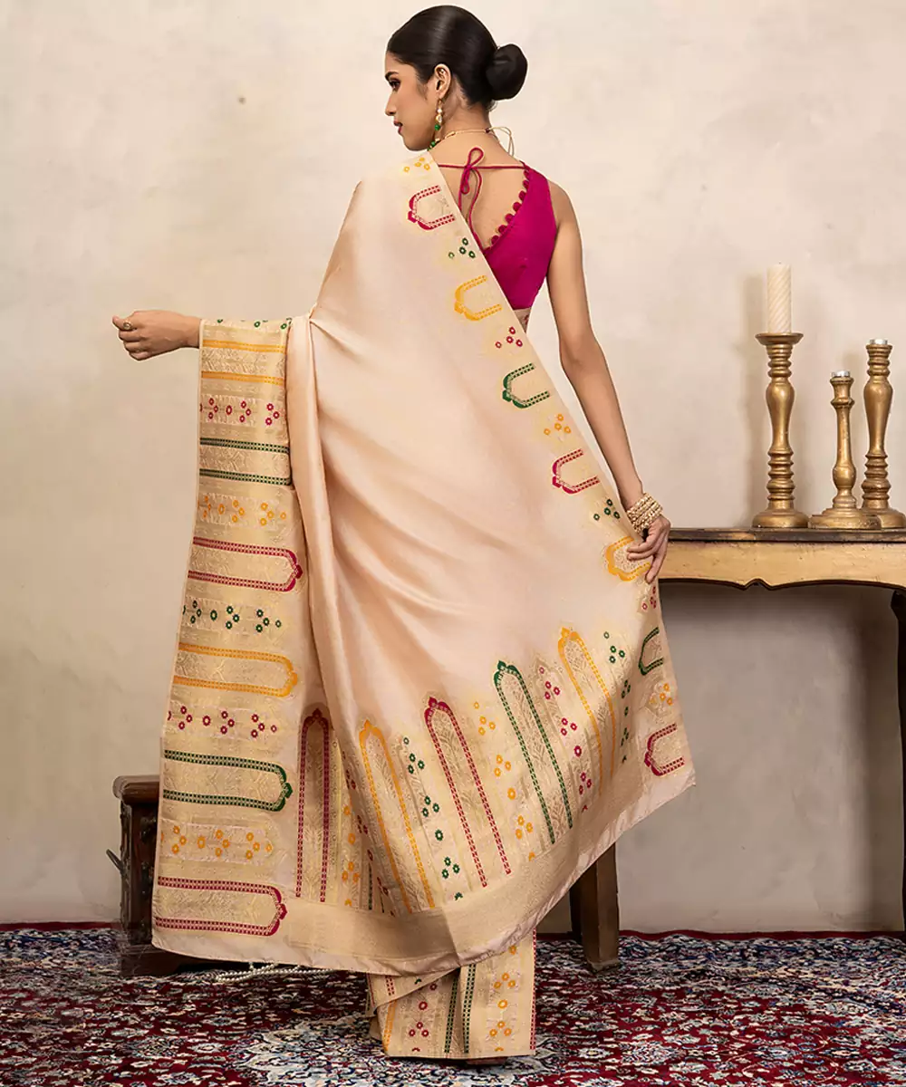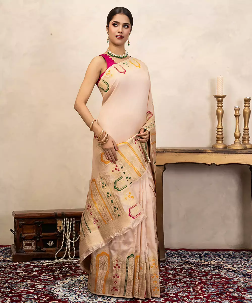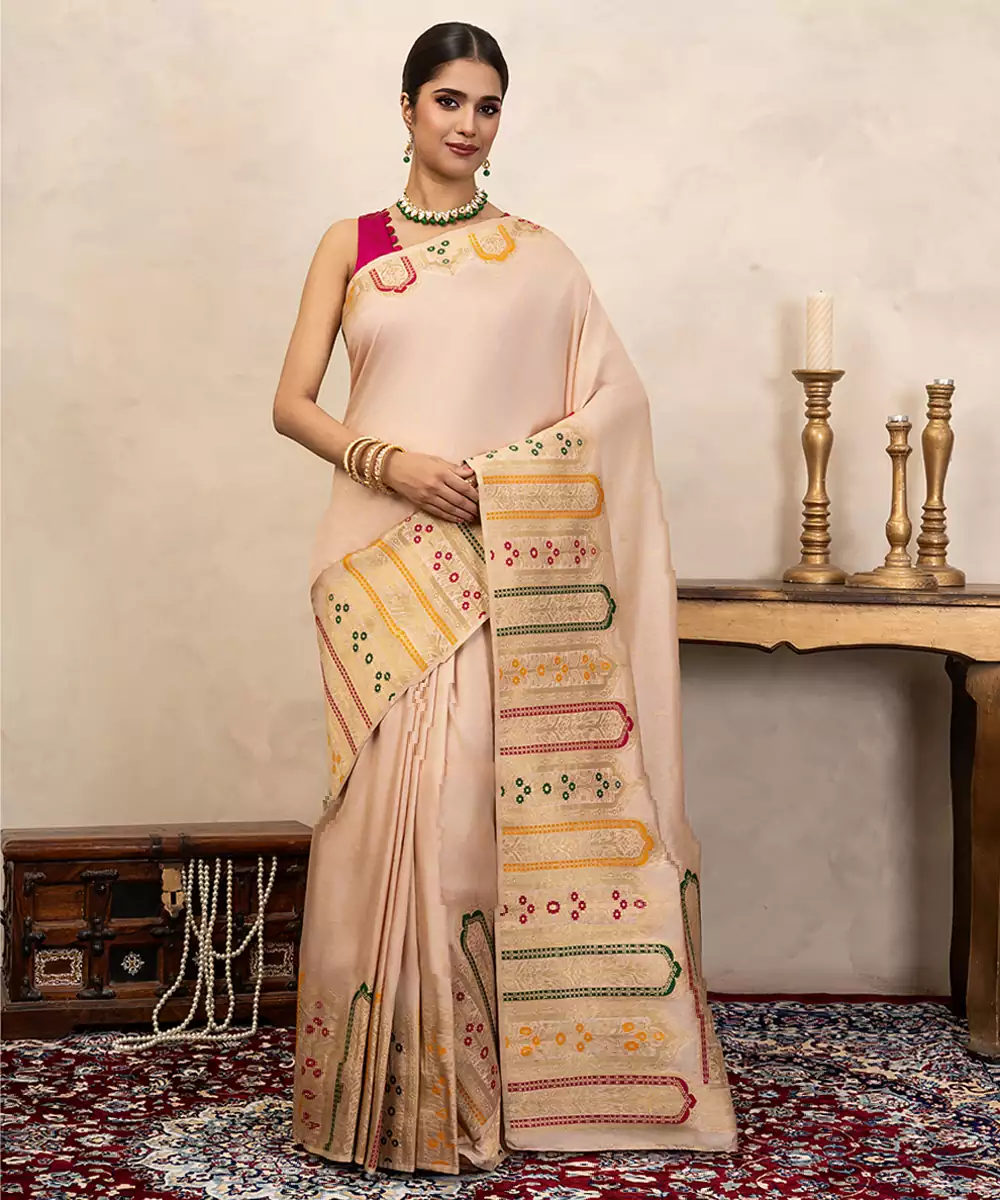 This Off White Banarasi Silk Saree Showcases Intricate Handwoven Detailing That Enhances Its Subtle Elegance. Its Luxurious Texture And Graceful Drape Make It Perfect For Festive Occasions. Pair It With Traditional Jewelry For A Timeless And Refined Look That Reflects Heritage Craftsmanship Beautifully.